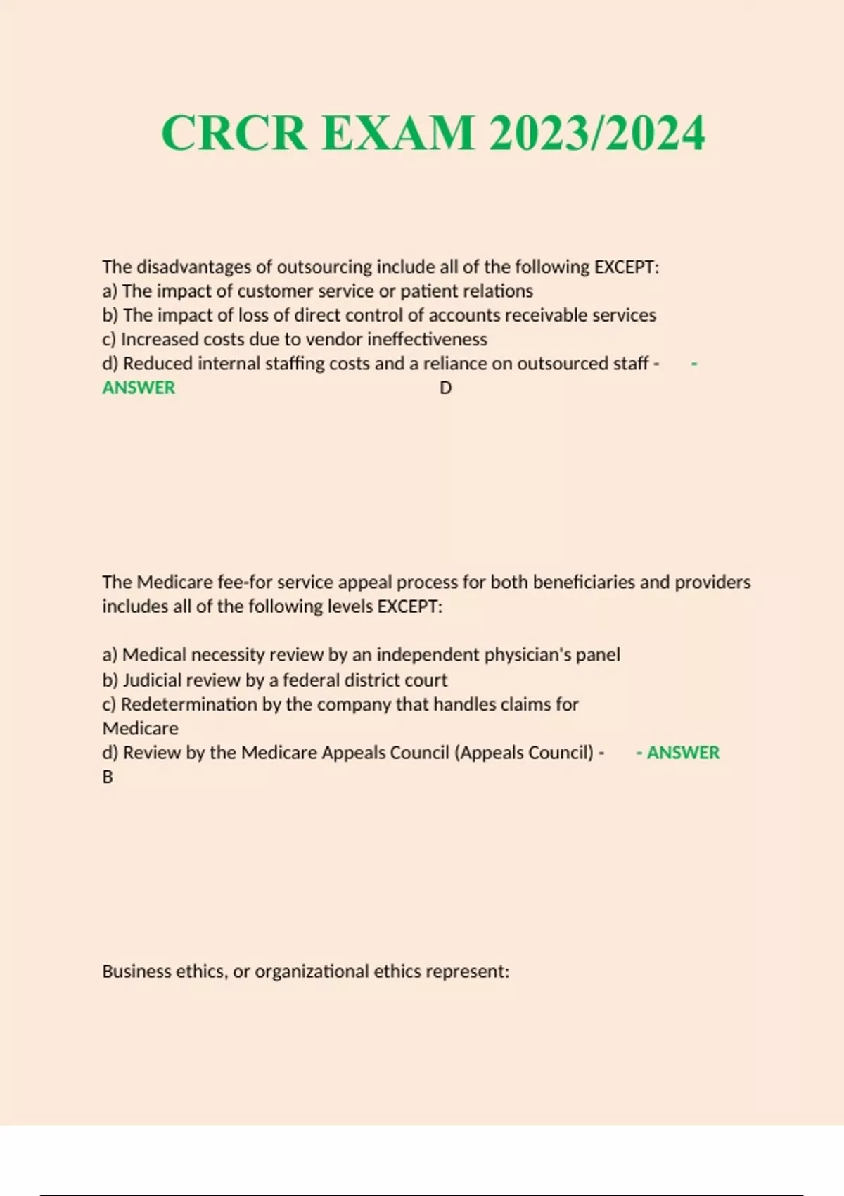 CRCR EXAM 2023/2024 The disadvantages of outsourcing include all of the following EXCEPT: a) The impact of customer service or patient relations b) The impact of loss of direct control of accounts receivable services c) Increased costs due to vendor ineffectiveness d) Reduced internal staffing costs and a reliance on outsourced staff - - ANSWER D The Medicare fee-for service appeal process for both beneficiaries and providers includes all of the following levels EXCEPT: a) Medical necessity review by an independent physician's panel b) Judicial review by a federal district court c) Redetermination by the company that handles claims for Medicare d) Review by the Medicare Appeals Council (Appeals Council) - - ANSWER B Business ethics, or organizational ethics represent: a) The principles and standards by which organizations operate b) Regulations that must be followed by law c) Definitions of appropriate customer service d) The code of acceptable conduct - - ANSWER A