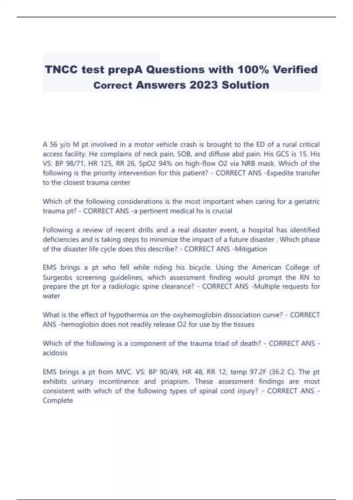TNCC test prepA Questions with 100% Verified Correct Answers 2023 Solution A 56 y/o M pt involved in a motor vehicle crash is brought to the ED of a rural critical access facility. He complains of neck pain, SOB, and diffuse abd pain. His GCS is 15. His VS: BP 98/71, HR 125, RR 26, SpO2 94% on high-flow O2 via NRB mask. Which of the following is the priority intervention for this patient? - CORRECT ANS -Expedite transfer to the closest trauma center Which of the following considerations is the most important when caring for a geriatric trauma pt? - CORRECT ANS -a pertinent medical hx is crucial Following a review of recent drills and a real disaster event, a hospital has identified deficiencies and is taking steps to minimize the impact of a future disaster . Which phase of the disaster life cycle does this describe? - CORRECT ANS -Mitigation EMS brings a pt who fell while riding his bicycle. Using the American College of Surgeobs screening guidelines, which assessment finding would prompt the RN to prepare the pt for a radiologic spine clearance? - CORRECT ANS -Multiple requests for water What is the effect of hypothermia on the oxyhemoglobin dissociation curve? - CORRECT ANS -hemoglobin does not readily release O2 for use by the tissues Which of the following is a component of the trauma triad of death? - CORRECT ANS -acidosis