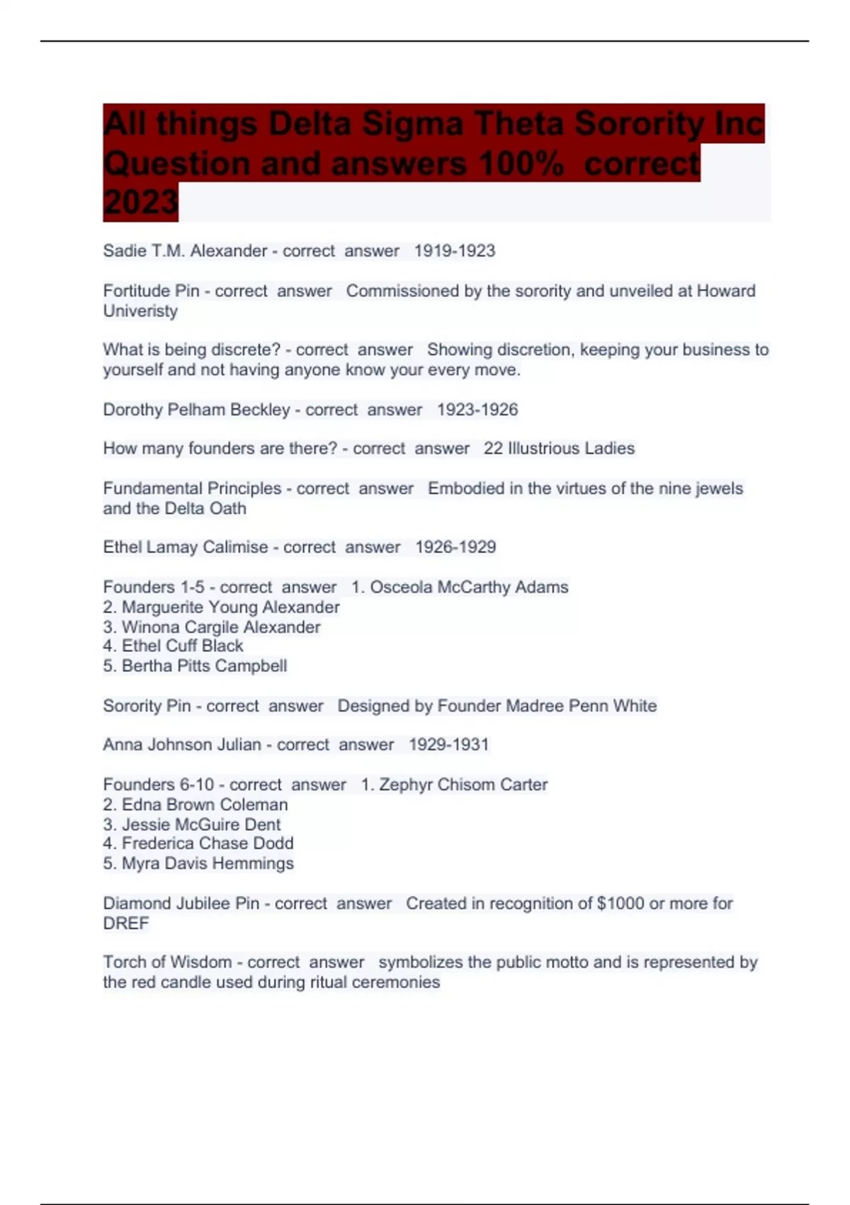 All things Delta Sigma Theta Sorority Inc Question and answers 100% correct 2023Sadie T.M. Alexander Fortitude Pin Commissioned by the sorority and unveiled at Howard Univeristy What is being discrete? Showing discretion, keeping your business to yourself and not having anyone know your every move. Dorothy Pelham Beckley How many founders are there? 22 Illustrious Ladies Fundamental Principles Embodied in the virtues of the nine jewels and the Delta Oath Ethel Lamay Calimise Founders 1-5 1. Osceola McCarthy Adams 2. Marguerite Young Alexander 3. Winona Cargile Alexander 4. Ethel Cuff Black 5. Bertha Pitts Campbell Sorority Pin Designed by Founder Madree Penn White Anna Johnson Julian Founders 6-10 1. Zephyr Chisom Carter 2. Edna Brown Coleman 3. Jessie McGuire Dent 4. Frederica Chase Dodd 5. Myra Davis Hemmings Diamond Jubilee Pin Created in recognition of $1000 or more for DREF