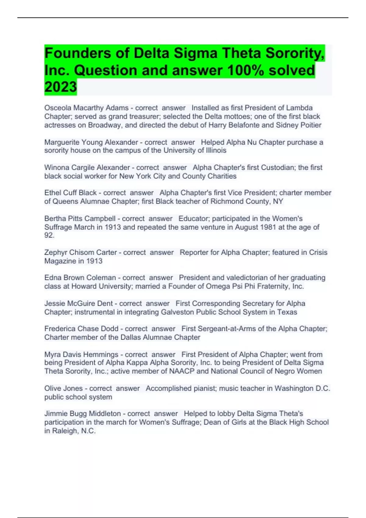 Founders of Delta Sigma Theta Sorority, Inc. Question and answer 100% solved 2023Osceola Macarthy Adams Installed as first President of Lambda Chapter; served as grand treasurer; selected the Delta mottoes; one of the first black actresses on Broadway, and directed the debut of Harry Belafonte and Sidney Poitier Marguerite Young Alexander Helped Alpha Nu Chapter purchase a sorority house on the campus of the University of Illinois Winona Cargile Alexander Alpha Chapter's first Custodian; the first black social worker for New York City and County Charities Ethel Cuff Black Alpha Chapter's first Vice President; charter member of Queens Alumnae Chapter; first Black teacher of Richmond County, NY Bertha Pitts Campbell Educator; participated in the Women's Suffrage March in 1913 and repeated the same venture in August 1981 at the age of 92. Zephyr Chisom Carter Reporter for Alpha Chapter; featured in Crisis Magazine in 1913 Edna Brown Coleman President and valedictorian of her graduating class at Howard University; married a Founder of Omega Psi Phi Fraternity, Inc. Jessie McGuire Dent First Corresponding Secretary for Alpha Chapter; instrumental in integrating Galveston Public School System in Texas Frederica Chase Dodd First Sergeant-at-Arms of the Alpha Chapter; Charter member of the Dallas Alumnae Chapter Myra Davis Hemmings First President of Alpha Chapter; went from being President of Alpha Kappa Alpha Sorority, Inc. to being President of Delta Sigma Theta Sorority, Inc.; active member of NAACP and National Council of Negro Women