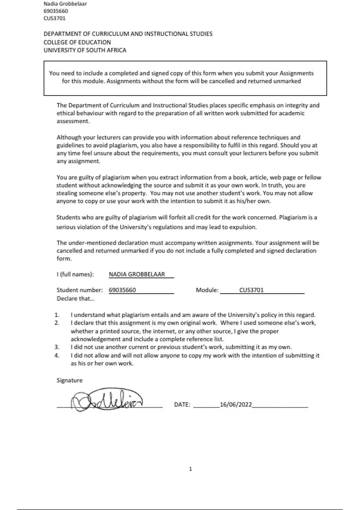1. I understand what plagiarism entails and am aware of the University’s policy in this regard.