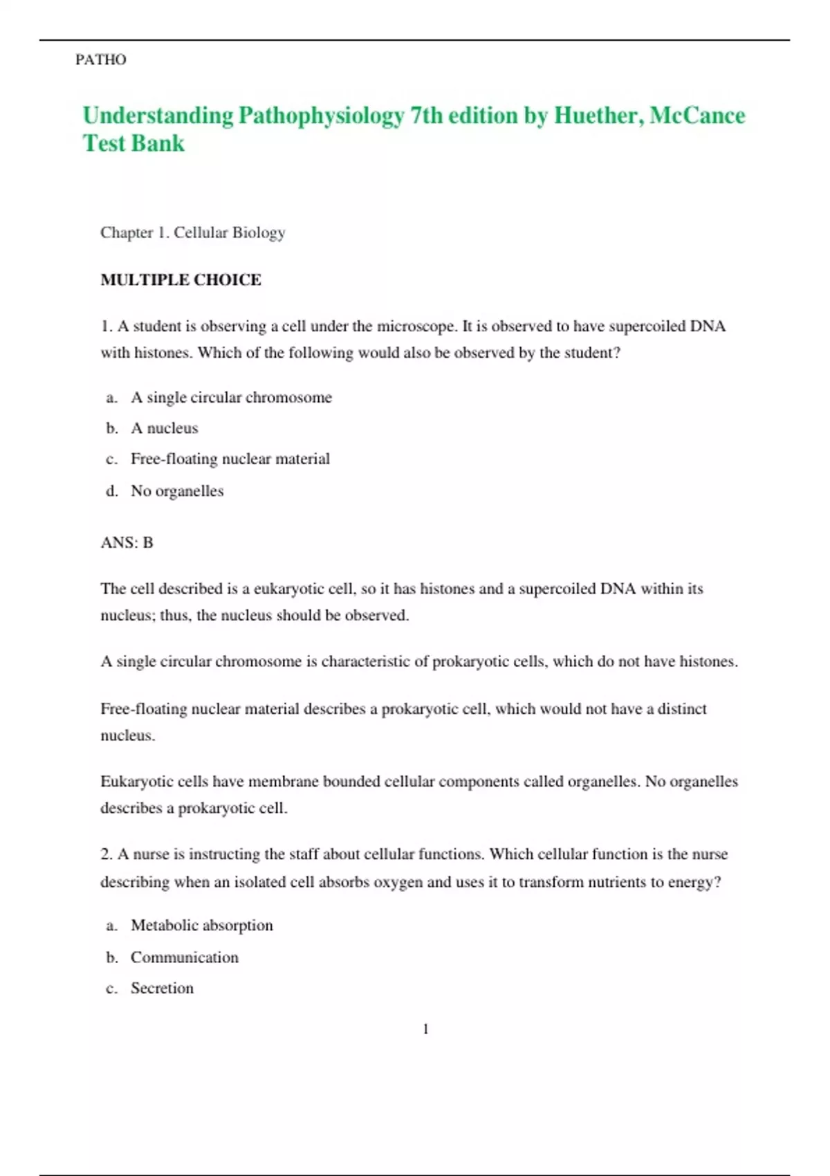 Understanding Pathophysiology 7th edition by Huether, McCance Test Bank Chapter 1. Cellular Biology MULTIPLE CHOICE 1. A student is observing a cell under the microscope. It is observed to have supercoiled DNA with histones. Which of the following would also be observed by the student? a. A single circular chromosome b. A nucleus c. Free-floating nuclear material d. No organelles ANS: B The cell described is a eukaryotic cell, so it has histones and a supercoiled DNA within its nucleus; thus, the nucleus should be observed. A single circular chromosome is characteristic of prokaryotic cells, which do not have histones. Free-floating nuclear material describes a prokaryotic cell, which would not have a distinct nucleus. Eukaryotic cells have membrane bounded cellular components called organelles. No organelles describes a prokaryotic cell. 2. A nurse is instructing the staff about cellular functions. Which cellular function is the nurse describing when an isolated cell absorbs oxygen and uses it to transform nutrients to energy? a. Metabolic absorption b. Communication c. Secretion d. Respiration ANS: D The ability of the cell to absorb oxygen refers to the cells function of respiration. The ability of the cell to function within a society of cells refers to its function of communication. The ability of the cell to take in nutrients refers to the cells function of metabolic absorption. The ability of the cell to synthesize new substances and secrete these elsewhere refers to the cells function of secretion. 3. A eukaryotic cell is undergoing DNA replication. In which region of the cell would most of the genetic information be contained? a. Mitochondria b. Ribosome c. Nucleolus d. Nucleus ANS: C The region of the cell that contains genetic material, including a large amount of ribonucleic acid, most of the DNA, and DNA-binding proteins, is the nucleolus. The mitochondria is the site of cellular respiration. The ribosomes are involved in manufacturing of proteins within the cell. The nucleus contains the nucleolus, and it is the nucleolus that contains genetic material. 4. The fluid mosaic model for biologic membranes describes membrane behavior. According to this model, which of the following float singly or as aggregates in the fluid lipid bilayer? a. Peripheral membrane proteins b. Integral membrane proteins c. Glycoproteins d. Cell adhesion molecules ANS: B Integral membrane proteins float freely in the fluid lipid bilayer. Peripheral membrane proteins are not embedded in the layer, but reside at the surface. Glycoproteins act as cell surface markers. Cell adhesion molecules are on the outside of the membrane and allow cells to hook together. 5. Which of the following can bind to plasma membrane receptors? a. Oxygen b. Ribosomes c. Amphipathic lipids d. Ligands ANS: D Ligands are specific molecules that can bind with receptors on the cell membrane. Oxygen moves by diffusion; it does not bind to receptors. Ribosomes make proteins and are not involved in binding. Amphipathic lipids are a portion of the cell membrane. 6. A nurse is reviewing a report from a patient with metastatic cancer. What finding would support the diagnosis of metastatic cancer? Alterations in extracellular matrix that include: a. Decreased fibronectin b. Increased collagen c. Decreased elastin d. Increased glycoproteins ANS: A Reduced amounts of fibronectin are found in some types of cancerous cells, allowing cancer cells to travel, or metastasize. Collagen provides strength, and its breakdown is associated with osteoarthritis, not cancer. Elastin is found in the lungs and allows tissues to stretch; it is not associated with cancerous cells. Decreased, not increased, glycoproteins are associated with cancerous cells. 7. Which form of cell communication is used to relate to other cells in direct physical contact? a. Cell junction b. Gap junction c. Desmosomes d. Tight junctions ANS: A Cell junctions hold cells together and permit molecules to pass from cell to cell. Gap junctions allow communication from the inside of one cell to the inside of another. Desmosomes are not involved in communication, but allow cells to hold together. Tight junctions are barriers that prevent movement of some substances and leakages of others. 8. Pancreatic beta cells secrete insulin, which inhibits secretion of glucagon from neighboring alpha cells. This action is an example of which of the following signaling types? a. Paracrine b. Autocrine c. Neurohormonal d. Hormonal ANS: A Paracrine signaling involves the release of local chemical mediators that are quickly taken up, destroyed, or immobilized, as in the case of insulin and the inhibition of the secretion of glucagon. When cells produce signals that they themselves respond to, autocrine signaling is used. Neurohormonal signaling involves secretion of hormones into the bloodstream by neurosecretory hormones. Hormonal signaling involves specialized endocrine cells that secrete hormone chemicals released by one set of cells that travel through the tissue through the bloodstream to produce a response in other sets of cells. 9. In cellular metabolism, each enzyme has a high affinity for a: a. Solute b. Substrate c. Receptor d. Ribosome ANS: B Each enzyme has a high affinity for a substrate, a specific substance converted to a product of the reaction. Solutes are small particles that pass through the cell membrane. A receptor is a site on the cell wall that allows transport into the cell. Ribosomes are located inside the cell and are not related to the work of enzymes. 10. An athlete runs a marathon, after which his muscles feel fatigued and unable to contract. The athlete asks the nurse why this happened. How should the nurse respond? A deficiency in can cause impaired muscle contraction. a. GTP b. AMP c. ATP d. GMP ANS: C The cell uses ATP for muscle contraction. when it is deficient, impaired muscle contraction results. GTP is involved in cell signaling, not muscle contraction. AMP is n