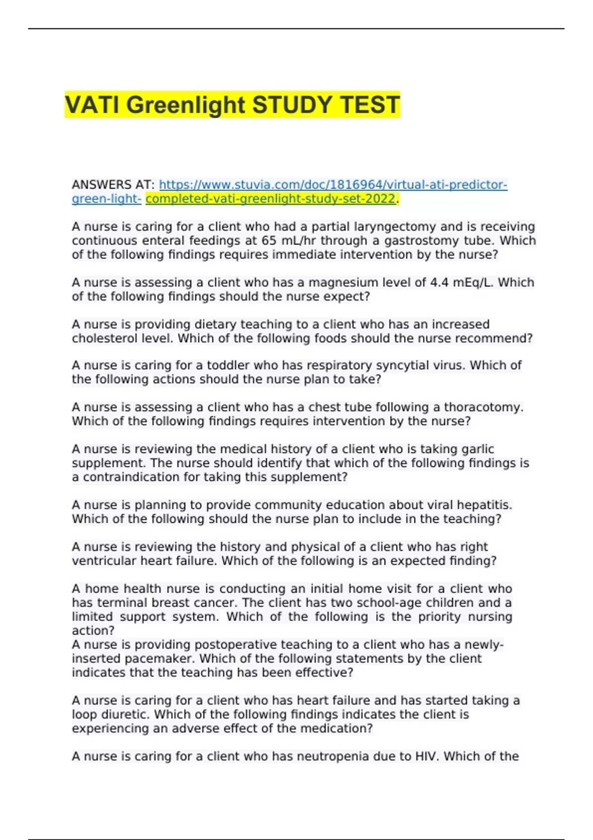 Virtual ATI predictor (Green Light)/ COMPLETED VATI Greenlight STUDY SET 2022.