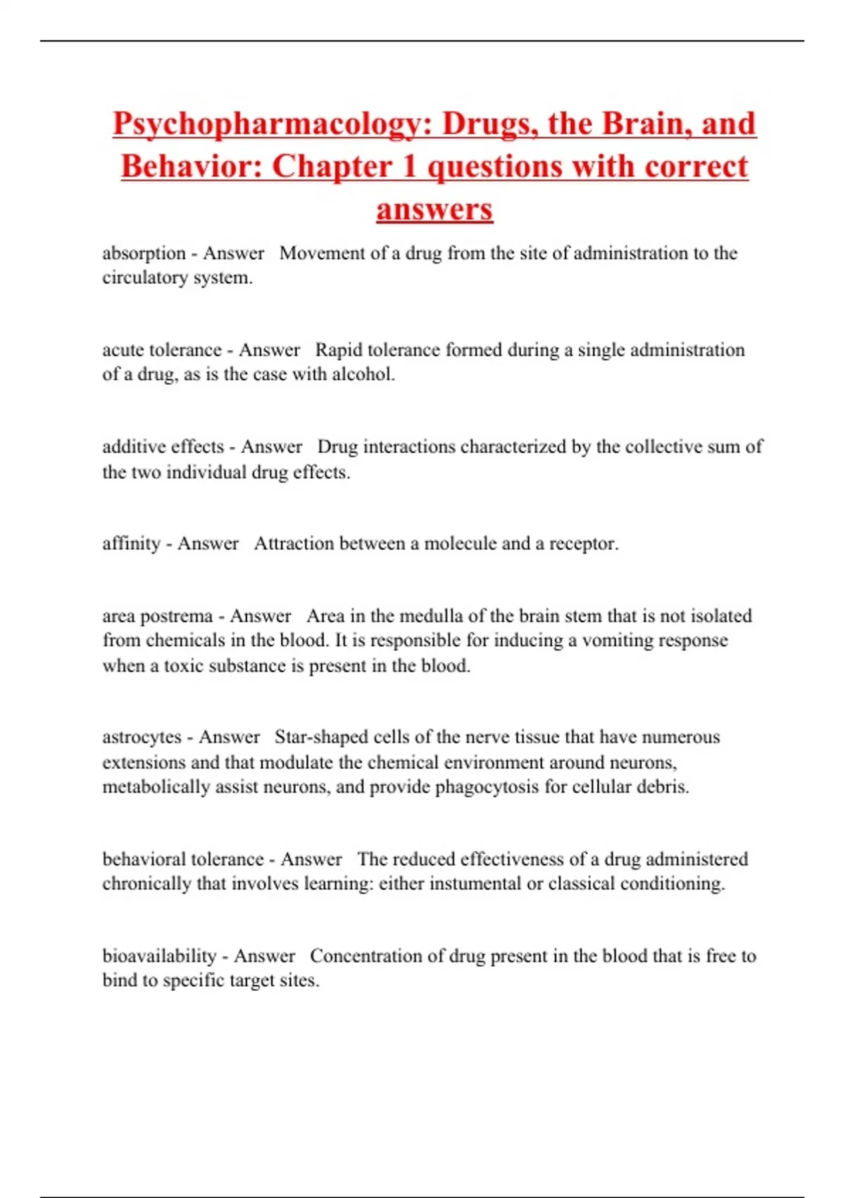 absorption - Answer Movement of a drug from the site of administration to the circulatory system. acute tolerance - Answer Rapid tolerance formed during a single administration of a drug, as is the case with alcohol. additive effects - Answer Drug interactions characterized by the collective sum of the two individual drug effects. affinity - Answer Attraction between a molecule and a receptor. area postrema - Answer Area in the medulla of the brain stem that is not isolated from chemicals in the blood. It is responsible for inducing a vomiting response when a toxic substance is present in the blood. astrocytes - Answer Star-shaped cells of the nerve tissue that have numerous extensions and that modulate the chemical environment around neurons, metabolically assist neurons, and provide phagocytosis for cellular debris. behavioral tolerance - Answer The reduced effectiveness of a drug administered chronically that involves learning: either instumental or classical conditioning. bioavailability - Answer Concentration of drug present in the blood that is free to bind to specific target sites.