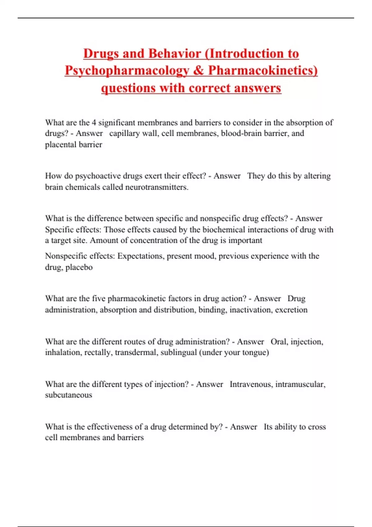 What are the 4 significant membranes and barriers to consider in the absorption of drugs? - Answer capillary wall, cell membranes, blood-brain barrier, and placental barrier How do psychoactive drugs exert their effect? - Answer They do this by altering brain chemicals called neurotransmitters. What is the difference between specific and nonspecific drug effects? - Answer Specific effects: Those effects caused by the biochemical interactions of drug with a target site. Amount of concentration of the drug is important Nonspecific effects: Expectations, present mood, previous experience with the drug, placebo What are the five pharmacokinetic factors in drug action? - Answer Drug administration, absorption and distribution, binding, inactivation, excretion What are the different routes of drug administration? - Answer Oral, injection, inhalation, rectally, transdermal, sublingual (under your tongue) What are the different types of injection? - Answer Intravenous, intramuscular, subcutaneous