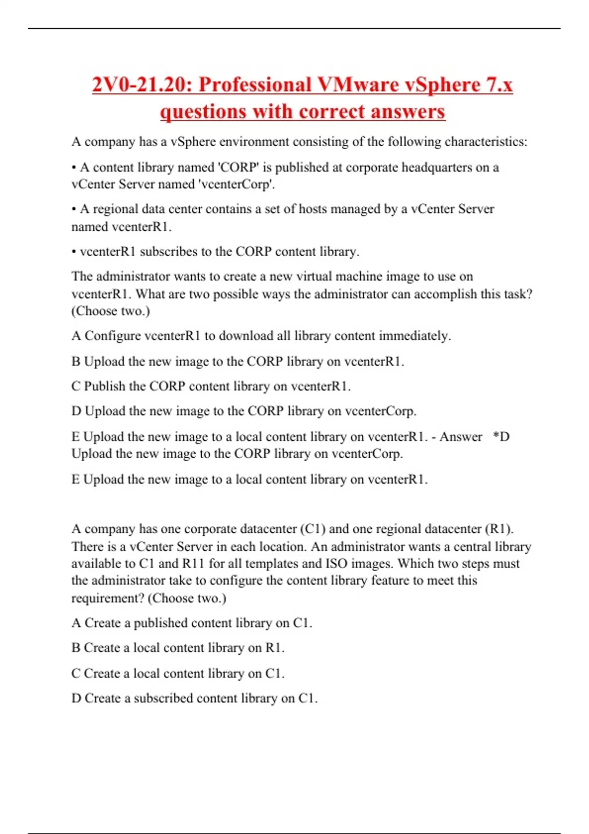 A company has a vSphere environment consisting of the following characteristics: • A content library named 'CORP' is published at corporate headquarters on a vCenter Server named 'vcenterCorp'. • A regional data center contains a set of hosts managed by a vCenter Server named vcenterR1. • vcenterR1 subscribes to the CORP content library. The administrator wants to create a new virtual machine image to use on vcenterR1. What are two possible ways the administrator can accomplish this task? (Choose two.) A Configure vcenterR1 to download all library content immediately. B Upload the new image to the CORP library on vcenterR1. C Publish the CORP content library on vcenterR1. D Upload the new image to the CORP library on vcenterCorp. E Upload the new image to a local content library on vcenterR1. - Answer *D Upload the new image to the CORP library on vcenterCorp. E Upload the new image to a local content library on vcenterR1. A company has one corporate datacenter (C1) and one regional datacenter (R1). There is a vCenter Server in each location. An administrator wants a central library available to C1 and R11 for all templates and ISO images. Which two steps must the administrator take to configure the content library feature to meet this requirement? (Choose two.) A Create a published content library on C1. B Create a local content library on R1. C Create a local content library on C1. D Create a subscribed content library on C1.