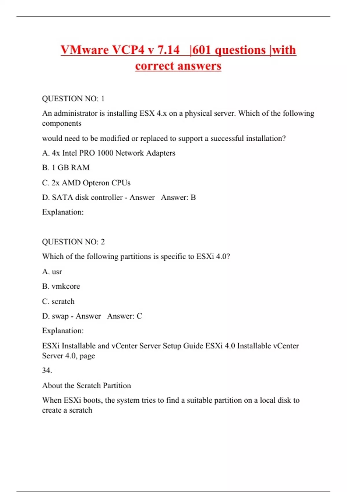 QUESTION NO: 1 An administrator is installing ESX 4.x on a physical server. Which of the following components would need to be modified or replaced to support a successful installation? A. 4x Intel PRO 1000 Network Adapters B. 1 GB RAM C. 2x AMD Opteron CPUs D. SATA disk controller - Answer Answer: B Explanation: QUESTION NO: 2 Which of the following partitions is specific to ESXi 4.0? A. usr B. vmkcore C. scratch D. swap - Answer Answer: C Explanation: ESXi Installable and vCenter Server Setup Guide ESXi 4.0 Installable vCenter Server 4.0, page 34. About the Scratch Partition When ESXi boots, the system tries to find a suitable partition on a local disk to create a scratch