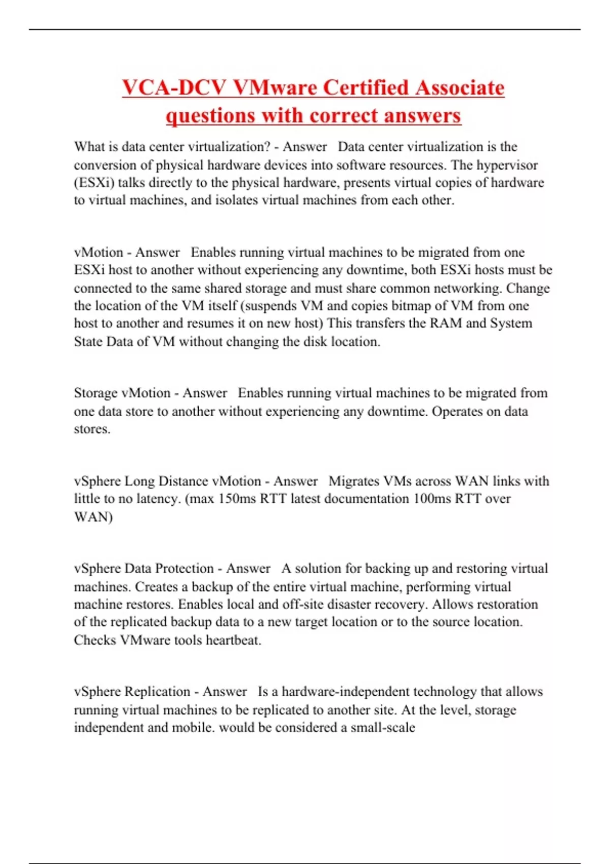 What is data center virtualization? - Answer Data center virtualization is the conversion of physical hardware devices into software resources. The hypervisor (ESXi) talks directly to the physical hardware, presents virtual copies of hardware to virtual machines, and isolates virtual machines from each other. vMotion - Answer Enables running virtual machines to be migrated from one ESXi host to another without experiencing any downtime, both ESXi hosts must be connected to the same shared storage and must share common networking. Change the location of the VM itself (suspends VM and copies bitmap of VM from one host to another and resumes it on new host) This transfers the RAM and System State Data of VM without changing the disk location. Storage vMotion - Answer Enables running virtual machines to be migrated from one data store to another without experiencing any downtime. Operates on data stores. vSphere Long Distance vMotion - Answer Migrates VMs across WAN links with little to no latency. (max 150ms RTT latest documentation 100ms RTT over WAN) vSphere Data Protection - Answer A solution for backing up and restoring virtual machines. Creates a backup of the entire virtual machine, performing virtual machine restores. Enables local and off-site disaster recovery. Allows restoration of the replicated backup data to a new target location or to the source location. Checks VMware tools heartbeat. vSphere Replication - Answer Is a hardware-independent technology that allows running virtual machines to be replicated to another site. At the level, storage independent and mobile. would be considered a small-scale disaster