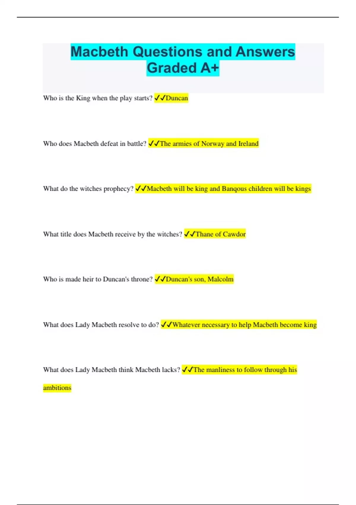 Macbeth Questions and Answers Graded A+ Who is the King when the play starts? Duncan Who does Macbeth defeat in battle? The armies of Norway and Ireland What do the witches prophecy? Macbeth will be king and Banqous children will be kings What title does Macbeth receive by the witches? Thane of Cawdor Who is made heir to Duncan's throne? Duncan's son, Malcolm What does Lady Macbeth resolve to do? Whatever necessary to help Macbeth become king What does Lady Macbeth think Macbeth lacks? The manliness to follow through his ambitions What does Lady Macbeth's words "unsex me here" mean? She wants to set aside feminine sentiments that could hinder her bloody ambitions What does Macbeth realize about the consequences of Duncan's murder? Other than satisfying his own ambitions, it will make everything worse What is Lady Macbeth's plan for murdering Duncan? Macbeth will stab him in his sleep and then blame it on the servants Why is Banquo up late? He had nightmares about the witches What vision does Macbeth have before he kills Duncan? He sees a bloody dagger floating in front of him What does Macbeth hear a voice saying? That he murdered sleep Why does Lady Macbeth say she didn't kill the king herself? He looked like her father in her sleep Hoe does Lady Macbeth feel about how Macbeth carried out the murder? She is ashamed about how scarred he acts throughout the whole thing What does the porter say drinking causes? a red nose, sleep, urination, and impotence Who kills the servants who look guilty of the murder? Macbeth How does Lady Macbeth publicly react to the news of the murder? She says it is horrible and pretends to faint Why do Malcolm and Donalbain run away from the court? They fear they are next to be murdered Why is Macbeth named king instead of Duncan's son and heir, Malcolm? Because Malcolm's flight makes him look guilty What does Banquo wonder about the witches prophecy? If his descendants will really become king How does Macbeth feel about Banquo? He fears that Banquo and his sons will cut short his reign What does Macbeth hire three men to do? Kill Banquo and his son Does Lady Macbeth think that this murder of Banquo and his son are necessary? No, but she will help him if he does Do the assassins succeed in killing Banquo and Fleance? They kill Banquo but Fleance escapes What does Macbeth see when he enters the banquet? The bloody ghost of Banquo How does Lady Macbeth explain Macbeth's odd behavior? She says not to worry because he has had strange visions since childhood What does Hecate, the goddess of witchcraft plan for Macbeth? To show him visions that will falsely make him feel secure Why does Macduff go to England? To ask King Edward for aid in fighting Macbeth How many apparitions do the witches show Macbeth? Four What does Macbeth do when he hears Macduff has fled to England? He orders the murder of Macduff's family What do Macduff's wife and son argue about? Whether Macduff has betrayed them or not What does Malcolm say to Macduff to test his loyalty to Scotland? He says he is more ambitions, greedy, and bloodthirsty than Macbeth What does Macduff plan when he hears what happened to his family? Revenge on Macbeth What does Lady Macbeth obsess over as she goes mad? Blood she cannot wash off her hands What armies join forces against Macbeth? The Scottish and the British What does it mean when Birnam wood comes to Dunsinane? The advancing army rides to Dunsinane holding branches from Burnam wood In what way is Macduff not of woman born? He was born by cesarean section Who kills Macbeth and puts his head on a spike? Macduff