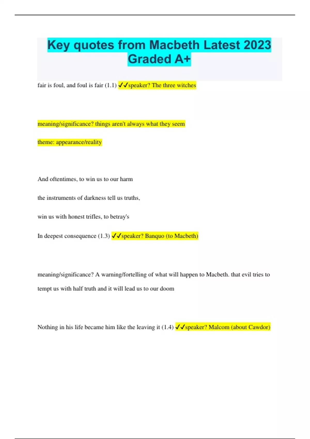 Key quotes from Macbeth Latest 2023 Graded A+ fair is foul, and foul is fair (1.1) speaker? The three witches meaning/significance? things aren't always what they seem theme: appearance/reality And oftentimes, to win us to our harm the instruments of darkness tell us truths, win us with honest trifles, to betray's In deepest consequence (1.3) speaker? Banquo (to Macbeth) meaning/significance? A warning/fortelling of what will happen to Macbeth. that evil tries to tempt us with half truth and it will lead us to our doom Nothing in his life became him like the leaving it (1.4) speaker? Malcom (about Cawdor) Meaning/significance? showing how a person can die with dignity/die well (by repenting), also it contrasted a good death to Macbeth's death (bad death) If chance will have me King, why Chance may crown me, Without my stir. (1.3) Speaker? Macbeth Meaning/significance? Macbeth is hoping he will not have to do anything to become king, that fate will take care of it theme: fate That is a step on which I must fall down or o'er leap Stars, hide your fires! Let not light see my black and deep desires. (1.4) speaker? Macbeth (to himself) Meaning/significance? he is now commited to killing Duncan...it shows the growth of evil in Macbeth... showing what side he is aligning with... first step down a slipper slope Yet do I fear thy nature. It is too full o' the milk of human kindness To catch the nearest way. (1.5) speaker? Lady Macbeth (to herself) Meaning/significance? L. Macbeth is worried about her husband's wishwashiness... shows gender bending (shes crueler) theme:gender bending Come, you spirits That tend on mortal thoughts, unsex me here, And fill me, from the crown to the toe, top-full Of direst cruelty! (1.5) speaker? Lady Macbeth Meaning/significance? shows L.Macbeth siding with evil forces themes: unnatural, gender bending Look like the innocent flower, But be the serpent under't. (I.5) speaker? Lady Macbeth (to Macbeth) meaning/significance? L.Macbeth is telling her husband to lie and act innocent themes: appearance/reality I have no spur To prick the sides of my intent, but only Vaulting ambition, which o'erleaps itself And falls on the other - (1.7) speaker? Macbeth meaning