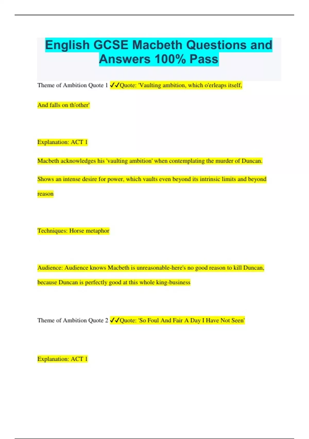 English GCSE Macbeth Questions and Answers 100% Pass Theme of Ambition Quote 1 Quote: 'Vaulting ambition, which o'erleaps itself, And falls on th'other' Explanation: ACT 1 Macbeth acknowledges his 'vaulting ambition' when contemplating the murder of Duncan. Shows an intense desire for power, which vaults even beyond its intrinsic limits and beyond reason Techniques: Horse metaphor Audience: Audience knows Macbeth is unreasonable-here's no good reason to kill Duncan, because Duncan is perfectly good at this whole king-business Theme of Ambition Quote 2 Quote: 'So Foul And Fair A Day I Have Not Seen' Explanation: ACT 1 The day is foul due to the witches raising a storm, and fair because of Macbeth's victories on the battlefield. The witches had not mentioned murder. The fact that his first thought is about killing the king is mighty suspicious—almost as though they've just awoken a murderous ambition that's been there all along. Techniques: Repetition of witches words, paradox Audience: sees immediately the calamitous inseparability of Macbeth and the forces of darkness. Alternative interpretation: foreshadows Macbeth's future. "Fair" presages his own rise to the throne, as well as the promise of Banquo's own sons also gaining the ascendency. "Foul" will refer to the tragedy that is to come. Duncan dies, as well as Macbeth and his wife. Theme of The supernatural Quote 1 Quote: 'Would they have stayed' Explanation: ACT 1 The witches tell Macbeth something that lingers on his mind, and he is hooked on them from the start. He wanted to know where the witches got their information and why they have told it to him and Banquo and so Macbeth is filled with regret Context: People belived in witches- they were people who had made a pact with the devil in exchange for supernatural powers. 1604 witchcraft became a capital offense. Theme of The supernatural Quote 2 Quote: 'Fair is foul, and foul is fair' Explanation: ACT 1 Said by the witches and Macbeth. The witches cause the 'foul' atmosphere. Techniques: paradox Audience: Audience knows they are bad, as well as influential and confusing characters. Context: 1604 witchcraft became a capital offence. Theme of Revenge Quote 1 Quote: 'It will have blood, they say; blood will have blood' Explanation: ACT 3 Banquo's ghost suggests he's seeking revenge on his death, and Macbeth notices this. Now that Macbeth has taken life, his life will be taken- his bloody path of murder must lead to other murders Techniques: repetition Audience: Audience may be fearful of what will happen to him because of his actions Links: Macbeth alludes to the sons of Duncan earlier in Act 3, scene 1, with the word "bloody" Context: the Elizabeth Chain of Being: whatever affects one thing affect others Alternative interpretation: the shedding of Banquo's blood will have to lead to (get) the shedding of his sons' blood as well, because the prediction was that Banquo should be the father of kings, which Macbeth can't allow. Reference to the predictions of the three witches in Act 1, scene 3, who have told Banquo that his "blood" will have "blood" (sons)--"Thou shall get kings, though thou be none" Macbeth is feeling both guilt and paranoia. Theme of Revenge Quote 2 Quote: 'Banquo, with his blood-clotted hair, is smiling at me' Explanation: ACT 4 When Macbeth summons the witches, the ghost of Banquo 'smiles' at him. His revenge is complete and that his descendants will be kings. Links: Links to foreshadowed revenge in act 3- 'It will have blood, they say; blood will have blood' Theme of Guilt Quote 1 Quote: 'Methought I heard a voice cry "Sleep no more"' Explanation: ACT 2 Guilty conscience. Macbeth's crime is especially heinous because he killed a man while his victim was sound asleep Audience: Sees Macbeth is mentally unstable. Sees the consequences of his actions- guilt. Alternative interpretation: Macbeth has seen how vulnerable a king can be when he is sound asleep, and now he proposes to become the king himself. He is accepting the danger that goes with the position. Therefore he will be afraid to go to sleep and will suffer from insomnia for the rest of his life, driving him insane. It wouldn't help him any to be guarded- Duncan had two grooms supposedly guarding him. Theme of Guilt Quote 2 Quote: 'Why do you start and seem to fear, Things that do sound so fair?' Explanation: ACT 1 Banquo's guilty reaction. Banquo begins to believe in the witches, even though he doesn't want to. Techniques: Alliteration- snake, or serpent, in that they make that 's' sound Audience: Although we too know the witches are bad, we may too believe in them as Banquo now does too Links: The alliteration suggesting a snake links to the rest of the play- there is evil all around as the weird sisters give their prophecies and the seed of Macbeth's demise is planted. Theme of Kingship Quote 1 Quote: 'royalty of nature' Explanation: ACT 3 Macbeth is jealous of Banquo's 'royalty of nature'. Banquo, he notes, has the makings of a fine leader, being brave, wise and disciplined. Macbeth is worried that Banquo is destined to triumph over him. Context: Shakespeare always tried to flatter the King. Macbeth is worried that Banquo is destined to triumph over himjust as in Ancient Rome, the great political and military leader Mark Antony was eventually upstaged by Octavius Caesar who went on to become the first Roman emperor. Alternative interpretation: The phrase is an allusion to the Witches' prophecy that Banquo "shalt get kings" in Act 1 Theme of Kingship Quote 2 Quote: 'each new morn, new widows howl, new orphans cry' Explanation: ACT 4 Macbeth makes a terrible king- Macduff is doing here is telling Malcolm how bad things are in Scotland. Macbeth is killing many people. That is why there are new widows and new orphans every morning. Audience: Feel sympathy for the people of Scotland- 'widows' and 'orphans' will be grieving Theme of Order/disorder Quote 1 Quote: 'Stars, hide your fires'; Come thick night' Expla