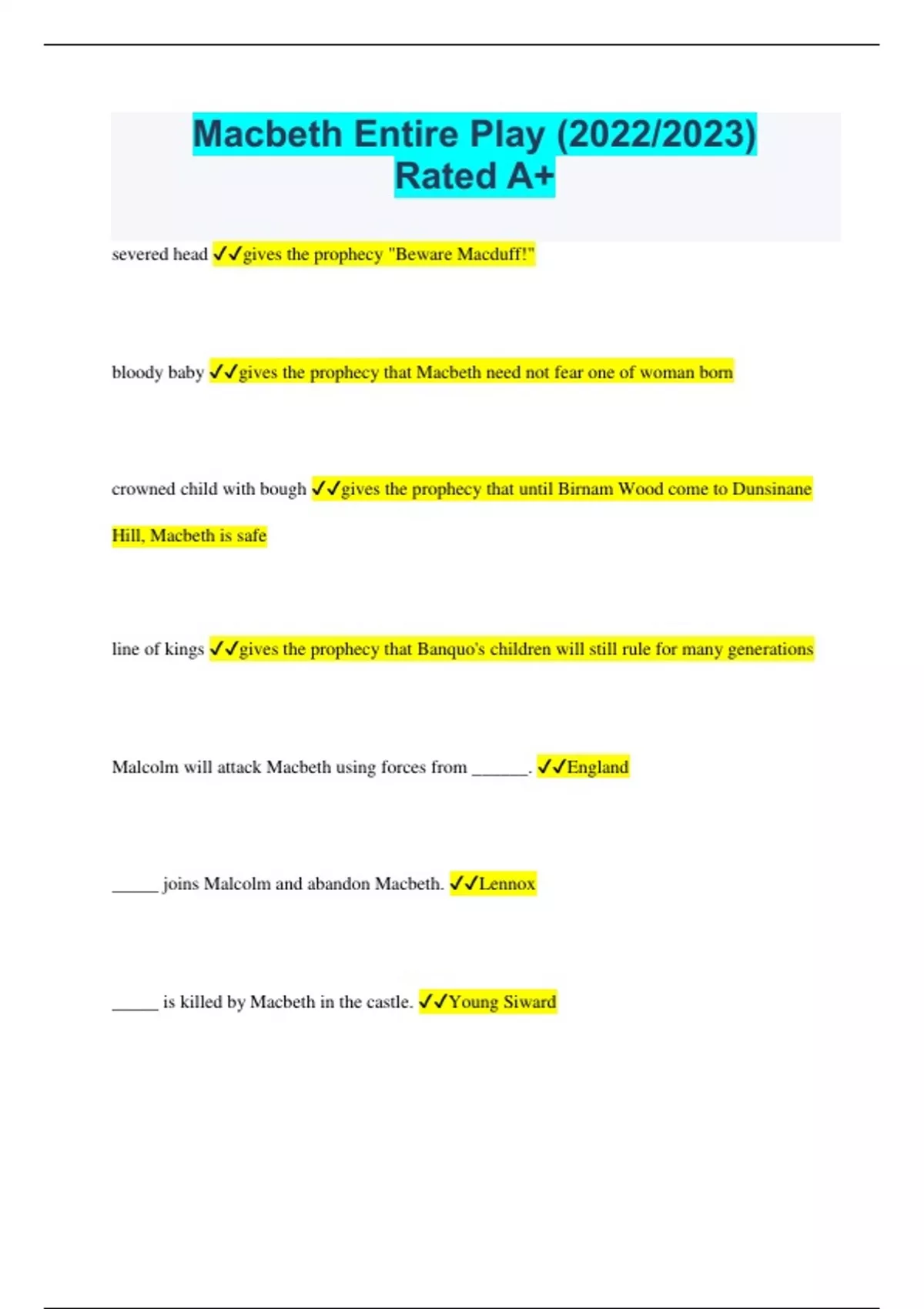 Macbeth Entire Play (2022/2023) Rated A+ severed head gives the prophecy "Beware Macduff!" bloody baby gives the prophecy that Macbeth need not fear one of woman born crowned child with bough gives the prophecy that until Birnam Wood come to Dunsinane Hill, Macbeth is safe line of kings gives the prophecy that Banquo's children will still rule for many generations Malcolm will attack Macbeth using forces from ______. England _____ joins Malcolm and abandon Macbeth. Lennox _____ is killed by Macbeth in the castle. Young Siward _____ is sent to attack Macbeth's castle first. Siward _____ dies due to a mental break down and a guilty conscience. Lady Macbeth _____ kills Macbeth in the castle. Macduff _____ is killed on stage in Act 4. Macduff's son _____ is killed in Fife by hired murderers. Lady Macduff _____ reports to Macduff that his family has been killed. Ross _____ tries to warn Lady Macduff of danger. a Messenger Malcolm lies to Macduff at first in order to _______. test Macduff's loyalty _____ is the only servant left on Macbeth's side at the end of the play. Seyton _____ inherits the throne at the end of the play. Malcolm _____ will somehow inherit the throne in the future based on the witches' prophecies. Fleance _____ was hired by Macbeth to try to cure his wife. the Doctor Lady Macbeth reenacts _____ while she sleepwalks. the murder of King Duncan Macbeth does not sit at the banquet table in Scene 4: because he sees Banquo's ghost in his seat Macbeth persuades two murderers to go after Banquo by: convincing them that Banquo is their enemy. When the murderers attack they succeed in: killing Banquo. The murderers fail during the attack when: Fleance escapes. The murderers are kept silent because: another murderer murders them. In Scene One Banquo suspects: Macbeth gained the throne through evil means. During Act Three, Macbeth is called into question as a leader due to: his failing mental state. Lady Macbeth changes in Act Three to: a scared and quiet woman. Scene Five that was cut out of the film version of the play, involves the character: Hecate. At the end of Act 3 the audience is made aware that: Macduff has gone to England to ask for help. Macduff plans to: overthrow Macbeth. Malcolm is in: England with Edward and Siward. Macbeth sees a _____ at the end of Scene One. a floating dagger ______ and _____ introduce Scene One. Banquo; Fleance At the end of Scene One ____ makes a noise and calls Macbeth to kill Duncan. a bell Lady Macbeth subdued the guards using: alcohol Lady Macbeth hears the cry of a(n) _____ while Macbeth is killing the king. screech owl _______ cried out in their sleep while Macbeth was killing the king. the guards What noise startles Macbeth and Lady Macbeth at the end of Scene Two? knocking The ______ answers the castle door in Scene Three. porter ______ and _____ arrive at Macbeth's castle in Scene Three. Macduff and Lennox ______ goes to wake the king and discovers the king is dead. Macduff ______ killed the guards when the king's body was discovered. Macbeth ______ and _______ are suspected of arranging the king's death. Donalbain; Malcom ______ flees to Ireland. Donalbain ____ flees to England. Malcolm ______ and ______ discuss the strange happenings of the night in Scene Four. Old Man; Ross The first strange thing described in Scene Four involved: an owl killing a falcon The second strange thing described in Scene Four involved: the King's horses escaping and eating each other In Scene Four _______ reveals that _____ will be the next king. Macduff; Macbeth a follower or underling of someone in power minion accurately predicting what will happen in the future prophetic a high place vantage a person who signals the arrival of another harbinger serious and urgent dire a broad ornamental band of sculpture on a building frieze friendless; unequal; unrivaled peerless to betray one's country or morals treason to call out to someone to attract attention hail bad; offensive to the senses foul the king of Scotland DUNCAN the catalyst that drives Macbeth to do evil LADY MACBETH Macbeth's best friend; the father of kings BANQUO betrayed the Scots to the Norwegians and was beheaded as a traitor THANE OF CAWDOR harbingers of Macbeth and Banquo's future WITCHES the country attacking the Scots Norway a barren landscape common in England and Scotland moor a short speech by a character that only the audience can hear aside the instance when the audience knows something that a character on stage is unaware of dramatic irony happens in Act 3 or the middle of a Shakespearean tragedy crisis happens in Act 2 of a Shakespearean tragedy complication happens t the end or in Act 5 of a Shakespearean tragedy catastrophe a trait of tragedy that shows a character with power or position must lose this power or position high status a trait of tragedy that shows a character getting the exact opposite of what is expected reversal of fate or fortune a trait of tragedy that shows the end of the play resulting in complete destruction of all major characters universal death a trait of tragedy that shows a main character has a specific personality trait that will lead to their undoing fatal flaw
