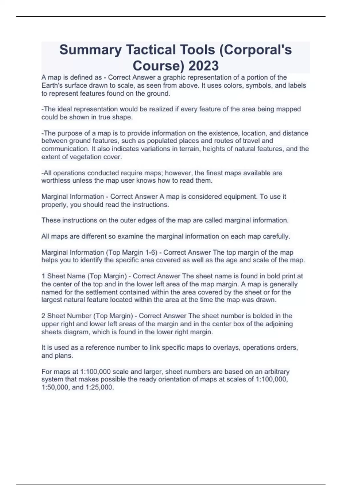 Summary Tactical Tools (Corporal's Course) 2023 A map is defined as - Correct Answer a graphic representation of a portion of the Earth's surface drawn to scale, as seen from above. It uses colors, symbols, and labels to represent features found on the ground. -The ideal representation would be realized if every feature of the area being mapped could be shown in true shape. -The purpose of a map is to provide information on the existence, location, and distance between ground features, such as populated places and routes of travel and communication. It also indicates variations in terrain, heights of natural features, and the extent of vegetation cover. -All operations conducted require maps; however, the finest maps available are worthless unless the map user knows how to read them. Marginal Information - Correct Answer A map is considered equipment. To use it properly, you should read the instructions. These instructions on the outer edges of the map are called marginal information. All maps are different so examine the marginal information on each map carefully. Marginal Information (Top Margin 1-6) - Correct Answer The top margin of the map helps you to identify the specific area covered as well as the age and scale of the map. 1 Sheet Name (Top Margin) - Correct Answer The sheet name is found in bold print at the center of the top and in the lower left area of the map margin. A map is generally named for the settlement contained within the area covered by the sheet or for the largest natural feature located within the area at the time the map was drawn. 2 Sheet Number (Top Margin) - Correct Answer The sheet number is bolded in the upper right and lower left areas of the margin and in the center box of the adjoining sheets diagram, which is found in the lower right margin. It is used as a reference number to link specific maps to overlays, operations orders, and plans. For maps at 1:100,000 scale and larger, sheet numbers are based on an arbitrary system that makes possible the ready orientation of maps at scales of 1:100,000, 1:50,000, and 1:25,000.