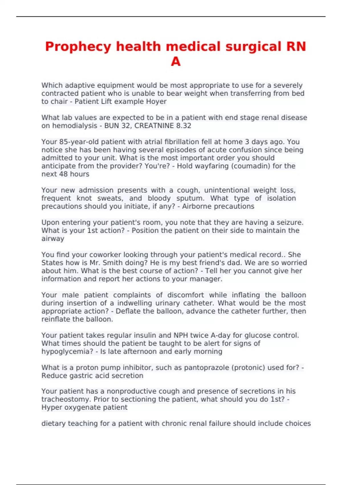 Which adaptive equipment would be most appropriate to use for a severely contracted patient who is unable to bear weight when transferring from bed to chair - Patient Lift example Hoyer What lab values are expected to be in a patient with end stage renal disease on hemodialysis - BUN 32, CREATNINE 8.32 Your 85-year-old patient with atrial fibrillation fell at home 3 days ago. You notice she has been having several episodes of acute confusion since being admitted to your unit. What is the most important order you should anticipate from the provider? You're? - Hold wayfaring (coumadin) for the next 48 hours Your new admission presents with a cough, unintentional weight loss, frequent knot sweats, and bloody sputum. What type of isolation precautions should you initiate, if any? - Airborne precautions