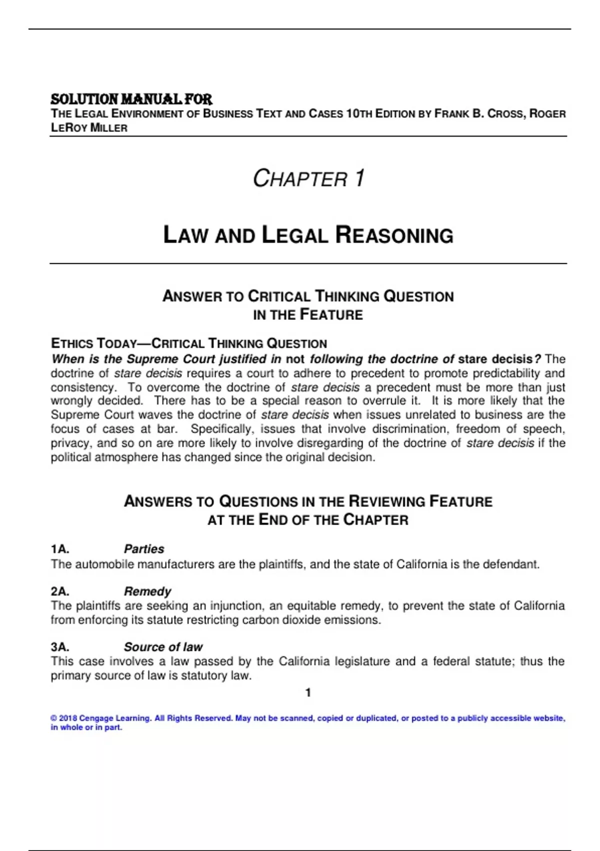 Solution Manual For The Legal Environment of Business Text and Cases 10th Edition by Frank B. Cross, Roger LeRoy