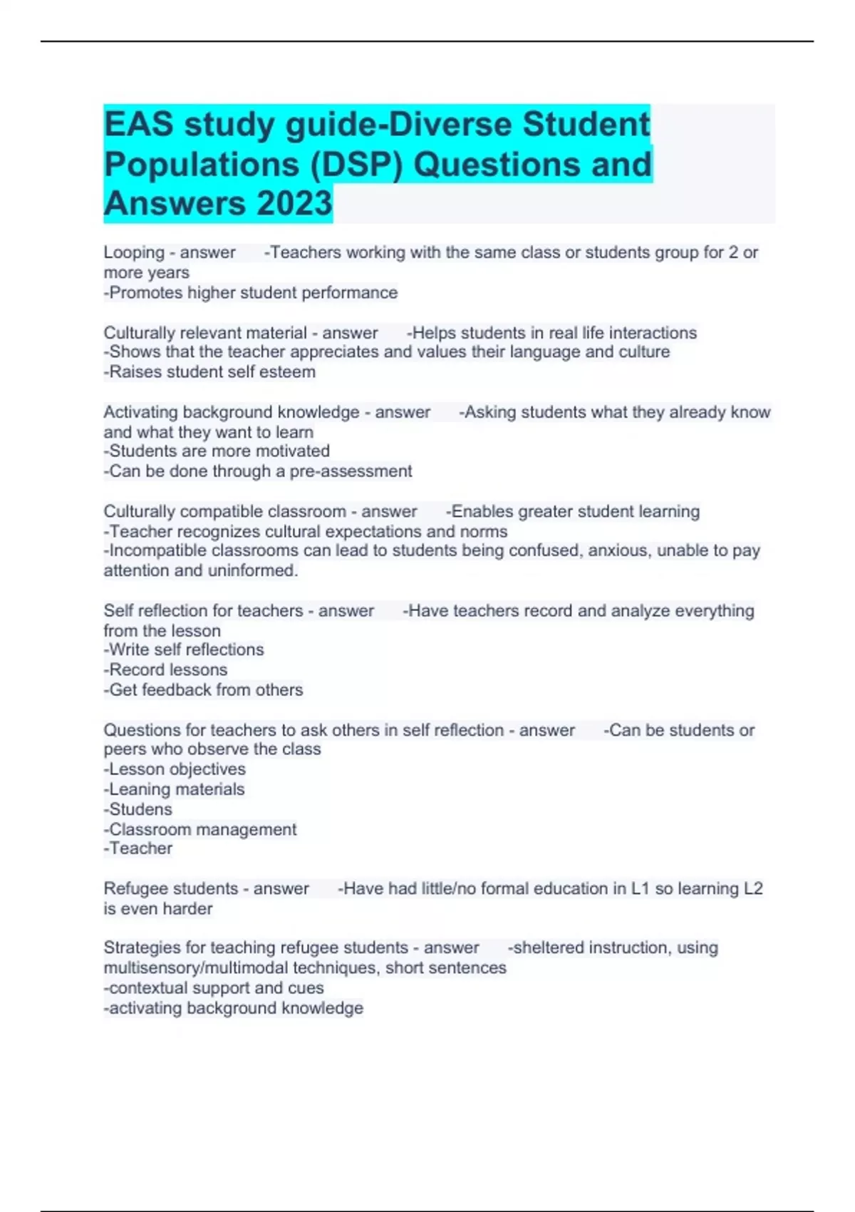 EAS study guide-Diverse Student Populations (DSP) Questions and Answers 2023 Looping -Teachers working with the same class or students group for 2 or more years -Promotes higher student performance Culturally relevant material -Helps students in real life interactions -Shows that the teacher appreciates and values their language and culture -Raises student self esteem Activating background knowledge -Asking students what they already know and what they want to learn -Students are more motivated -Can be done through a pre-assessment Culturally compatible classroom -Enables greater student learning -Teacher recognizes cultural expectations and norms -Incompatible classrooms can lead to students being confused, anxious, unable to pay attention and uninformed. Self reflection for teachers -Have teachers record and analyze everything from the lesson -Write self reflections -Record lessons -Get feedback from others Questions for teachers to ask others in self reflection -Can be students or peers who observe the class -Lesson objectives -Leaning materials -Studens -Classroom management -Teacher Refugee students -Have had little/no formal education in L1 so learning L2 is even harder Strategies for teaching refugee students -sheltered instruction, using multisensory/multimodal techniques, short sentences -contextual support and cues -activating background knowledge -teaching vocabulary explicitly -teaching before, during and after comprehension strategies -differentiated instruction Challenges for low-income students -Not having needs met -Not having educational resources -Less access to enrichment -More home responsibilities Difficulties for low-income students -Attending school and coming on time -Materials and homework -Staying awake and engaged -Communicating appropriately -Staying in and graduating school SIFE -Students with Interrupted Formal Education -L1 is not English -Entered US schools after 2nd grade -2 years less school than classmates -2 years behind classmates -Subgroup of ELL/LEP LEP -Limited English Proficiency -Speak little to no English because of foreign ancestry or birth -speak/understand little to no English or score below English Language proficient test. Impacts for SIFE -unfamiliar with new country and culture -culture shock, anxiety, confusion, feeling dislocated -can impede academic achievement Supports for SIFE -Giving instruction in L1 -supplementary programs with targeting interventions -structured learning experiences for social and emotional development -ensuring access to bilingual social workers and guidance counselors. Grouping for gifted students -enrichment -student interest -student ability -flexible grouping that is impermanent and targeting -cluster grouping that benefits gifted and typical students Acceleration for gifted students -AP -Continuos Progress curriculum with flexible pacing -dual or concurrent enrollment in higher grades/schools -Curriculum Compacting covering material in less time -Early Entrance -Skipping grades -Subject accelerations Enrichment for gifted students -Academic competitions -Independent study -Learning/Interest centers -Field trips -Mentorships -Weekend/Summer programs Differentiation -Tiered assignments -Learning contracts -Self directed learning -Learning centers -Problem-Based Learning -Seminars with small groups to learn what was not taught or to expand on what was taught Equitable classroom assessment -not teach all students the same -vary assessment -state learning outcomes and objectives -inform students of goals -give students lists of skills and concepts -give copies of the rubric -match assessment with instruction supporting task completion and skills -Students need to know content and how to respond to the assessment -Some students need to be taught test taking skills or how to use computer if they are not taught with them -students need thorough directions and examples Encouragement and assessment -All students need encouragement, especially from collectivist cultures or who think more holistically -standard based approaches and criterion referenced measures and the most fair -Teachers should evaluate the outcomes and see if anything needs to be changed Diversity in the classroom -Teachers should embrace diversity and show how differences are good -Create a classroom that values diversity -Establish a learning environment where every students feels respected and valued -Encourage students to learn about each other Welcoming atmosphere for ELL -Learn to pronounce their names correctly -offer one-on-one assistance -Assign classmates, particularly if they are bilingual or know the ELLs L1 -Post daily schedules -Invite to share cultural aspects Including diverse cultures -Have classroom materials with various cultures and languages -Labeling classroom objects -Cooperative learning styles -Use visuals -Treat all students fairly with equal accountability for behavior 3 Characteristics of Culturally Responsive Teaching -Sociocultural consciousness-understand how socioculture influences how people live and behave and keep that in mind -Affirmative attitudes-respect cultural differences and incorporate instruction related to culture -Commitment to and skills for acting as agents of change 3 More Characteristics of Culturally Responsive Teaching -Constructivist philosophies about learning and teacher scaffolding for students to construct their own learning -Learning about student lives -Culturally responsive strategies Effectively Instructing Diverse Students -Develop bonds with students with no racism -Focus instruction on student construction of meaning -Collaborate with students -Preserve student ethnic and cultural identity and pride AVID -Achievement Via Individual Determination -All students in rigorous academic program, not tracking -explicit instruction including collaboration -higher percentage of college enrollment, particularly African American and Latino students After-School Youth Programs -Minimal budgets leads 