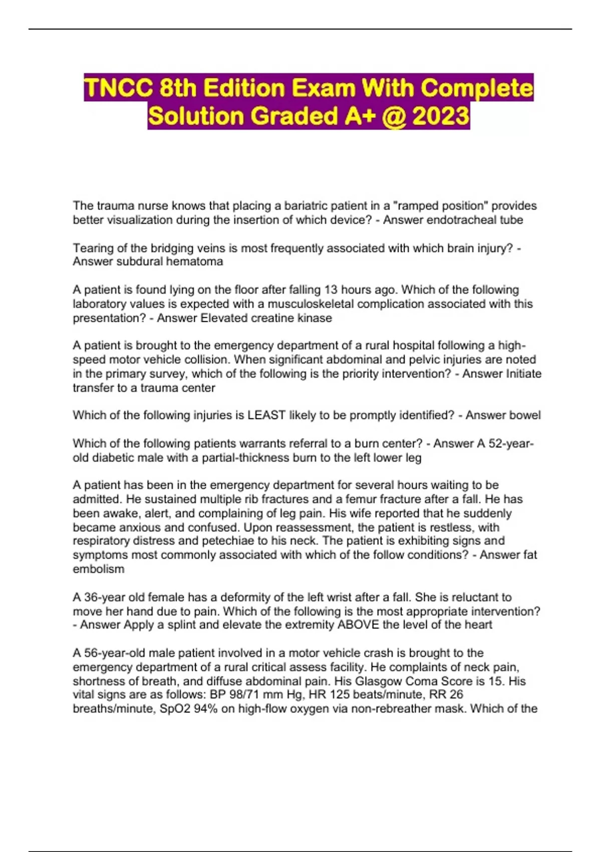 TNCC PACKAGED EXAMS WITH COMPLETE SOLUTION GRADED A+