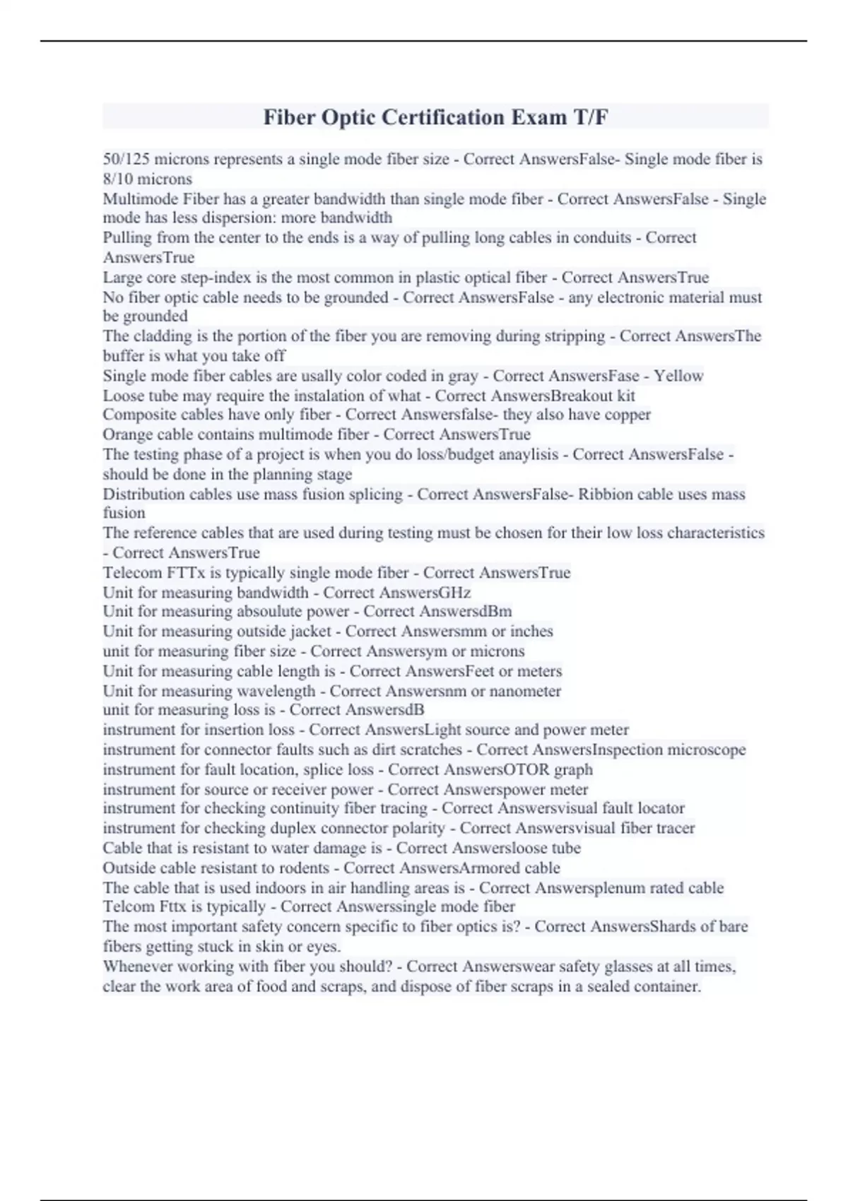 50/125 microns represents a single mode fiber size - Correct AnswersFalse- Single mode fiber is 8/10 microns Multimode Fiber has a greater bandwidth than single mode fiber - Correct AnswersFalse - Single mode has less dispersion: more bandwidth Pulling from the center to the ends is a way of pulling long cables in conduits - Correct AnswersTrue Large core step-index is the most common in plastic optical fiber - Correct AnswersTrue No fiber optic cable needs to be grounded - Correct AnswersFalse - any electronic material must be grounded The cladding is the portion of the fiber you are removing during stripping - Correct AnswersThe buffer is what you take off Single mode fiber cables are usally color coded in gray - Correct AnswersFase - Yellow Loose tube may require the instalation of what - Correct AnswersBreakout kit Composite cables have only fiber - Correct Answersfalse- they also have copper Orange cable contains multimode fiber - Correct AnswersTrue The testing phase of a project is when you do loss/budget anaylisis - Correct AnswersFalse - should be done in the planning stage Distribution cables use mass fusion splicing - Correct AnswersFalse- Ribbion cable uses mass fusion The reference cables that are used during testing must be chosen for their low loss characteristics - Correct AnswersTrue Telecom FTTx is typically single mode fiber - Correct AnswersTrue Unit for measuring bandwidth - Correct AnswersGHz Unit for measuring absoulute power - Correct AnswersdBm Unit for measuring outside jacket - Correct Answersmm or inches unit for measuring fiber size - Correct Answersym or microns Unit for measuring cable length is - Correct AnswersFeet or meters Unit for measuring wavelength - Correct Answersnm or nanometer unit for measuring loss is - Correct AnswersdB instrument for insertion loss - Correct AnswersLight source and power meter instrument for connector faults such as dirt scratches - Correct AnswersInspection microscope instrument for fault location, splice loss - Correct AnswersOTOR graph instrument for source or receiver power - Correct Answerspower meter instrument for checking continuity fiber tracing - Correct Answersvisual fault locator instrument for checking duplex connector polarity - Correct Answersvisual fiber tracer Cable that is resistant to water damage is - Correct Answersloose tube Outside cable resistant to rodents - Correct AnswersArmored cable The cable that is used indoors in air handling areas is - Correct Answersplenum rated cable Telcom Fttx is typically - Correct Answerssingle mode fiber The most important safety concern specific to fiber optics is? - Correct AnswersShards of bare fibers getting stuck in skin or eyes. Whenever working with fiber you should? - Correct Answerswear safety glasses at all times, clear the work area of food and scraps, and dispose of fiber scraps in a sealed container.