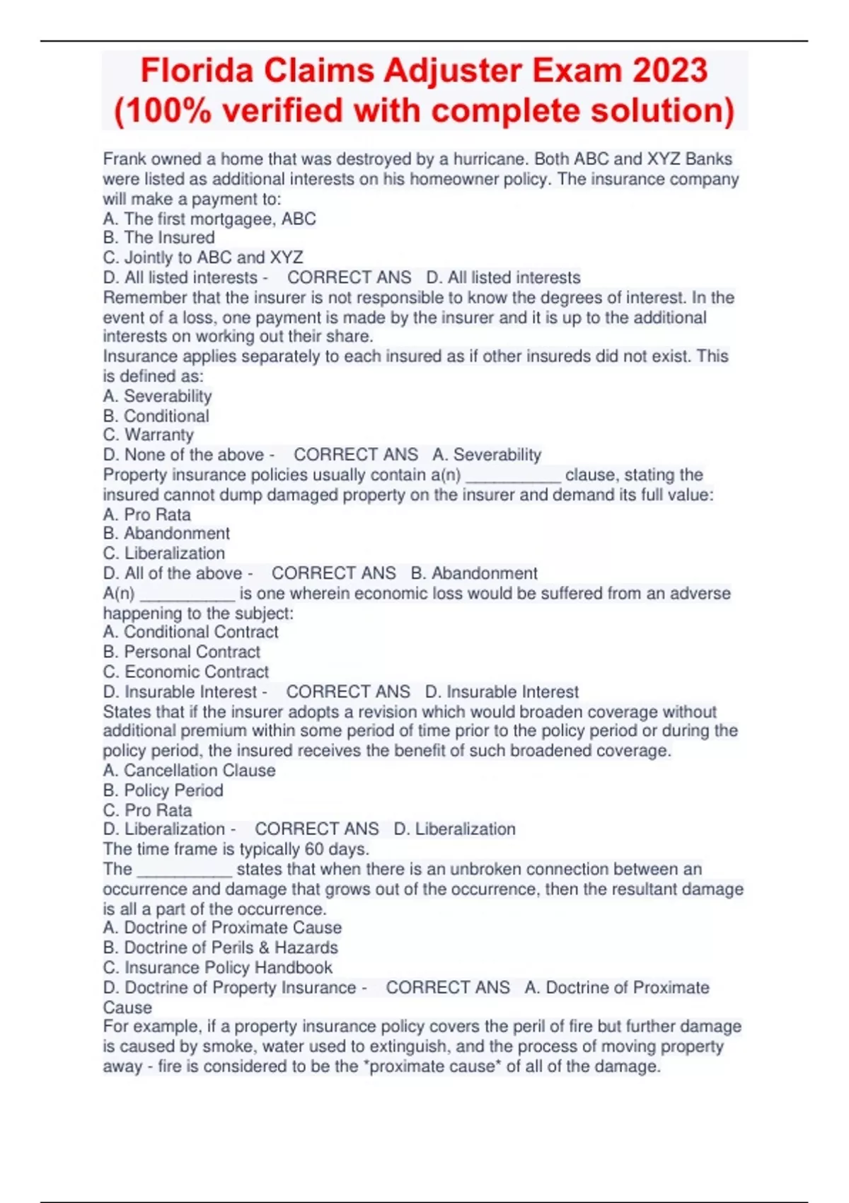 Florida Claims Adjuster Exam 2023 (100% verified with complete solution)