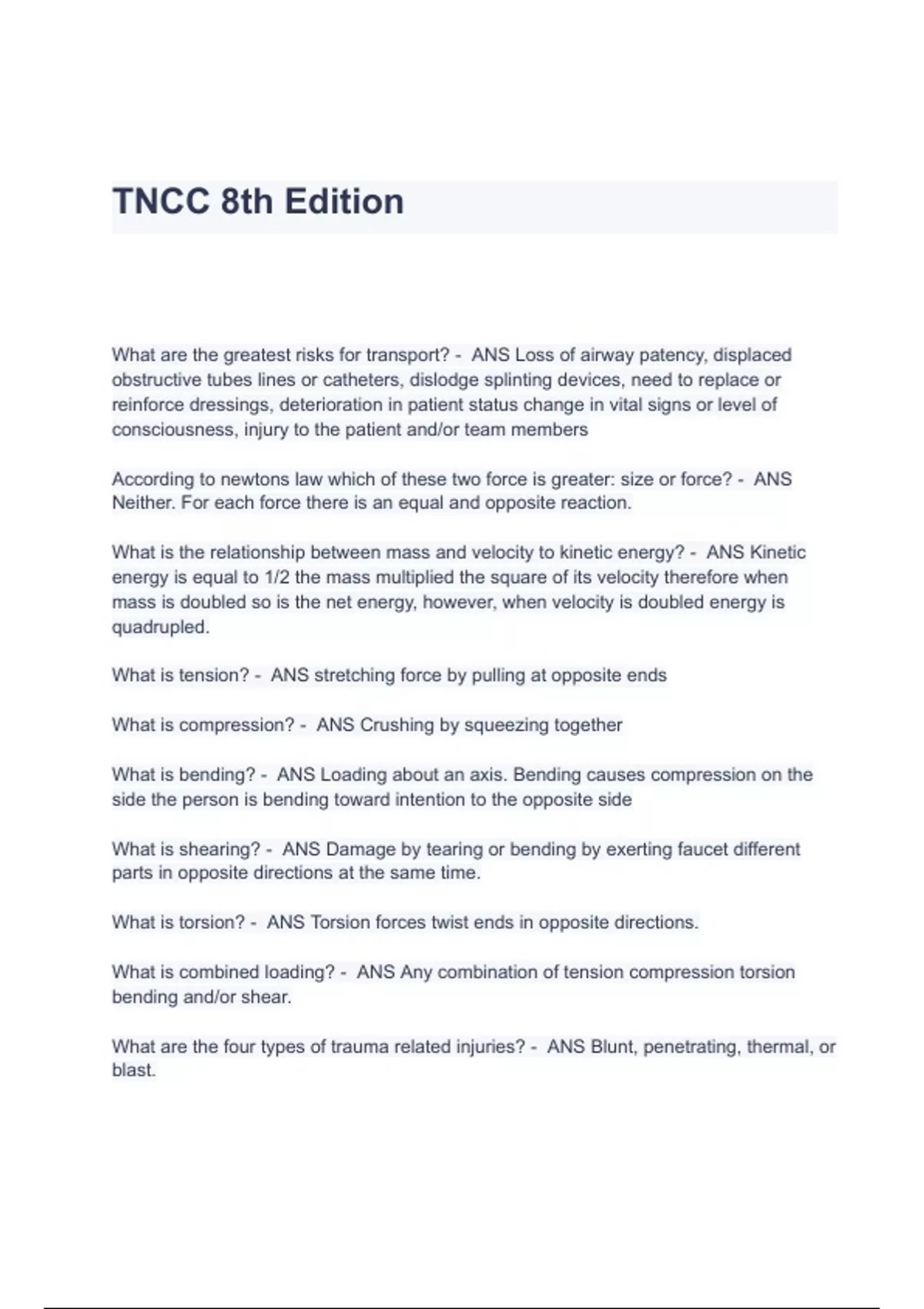 TNCC 8th Edition Questions & Answers 2023 ( A+ GRADEED 100% VERIFIED)