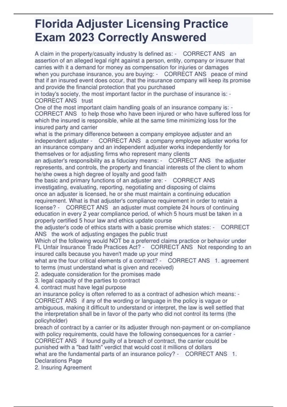 A claim in the property/casualty industry Is defined as: - CORRECT ANS an assertion of an alleged legal right against a person, entity, company or insurer that carries with it a demand for money as compensation for injuries or damages when you purchase insurance, you are buying: - CORRECT ANS peace of mind that if an insured event does occur, that the insurance company will keep its promise and provide the financial protection that you purchased in today's society, the most important factor in the purchase of insurance is: - CORRECT ANS trust One of the most important claim handling goals of an insurance company is: - CORRECT ANS to help those who have been injured or who have suffered loss for which the insured is responsible, while at the same time minimizing loss for the insured party and carrier what is the primary difference between a company employee adjuster and an independent adjuster - CORRECT ANS a company employee adjuster works for an insurance company and an independent adjuster works independently for themselves or for adjusting firms who represent many clients an adjuster's responsibility as a fiduciary means: - CORRECT ANS the adjuster represents, and controls, the property and financial interests of the client to whom he/she owes a high degree of loyalty and good faith the basic and primary functions of an adjuster are: - CORRECT ANS investigating, evaluating, reporting, negotiating and disposing of claims once an adjuster is licensed, he or she must maintain a continuing education requirement. What is that adjuster's compliance requirement in order to retain a license? - CORRECT ANS an adjuster must complete 24 hours of continuing education in every 2 year compliance period, of which 5 hours must be taken in a properly certified 5 hour law and ethics update course the adjuster's code of ethics starts with a basic premise which states: - CORRECT ANS the work of adjusting engages the public trust Which of the following would NOT be a preferred claims practice or behavior under FL Unfair Insurance Trade Practices Act? - CORRECT ANS Not responding to an insured calls because you haven't made up your mind what are the four critical elements of a contract? - CORRECT ANS 1. agreement to terms (must understand what is given and received) 2. adequate consideration for the promises made 3. legal capacity of the parties to contract 4. contract must have legal purpose an insurance policy is often referred to as a contract of adhesion which means: - CORRECT ANS if any of the wording or language in the policy is vague or ambiguous, making it difficult to understand or interpret, the law is well settled that the interpretation shall be in favor of the party who did not control its terms (the policyholder) breach of contract by a carrier or its adjuster through non-payment or on-compliance with policy requirements, could have the following consequences for a carrier - CORRECT ANS if found guilty of a breach of contract, the carrier could be punished with a "bad faith" verdict that would cost it millions of dollars what are the fundamental parts of an insurance policy? - CORRECT ANS 1. Declarations Page 2. Insuring Agreement 3. Exclusions 4. Conditions What is one of the duties of an insured following a loss? - CORRECT ANS giving prompt notice of loss to the insurer describe the difference between a peril and a hazard - CORRECT ANS a peril is a cause of loss, like fire. A hazard is a condition that exists beforehand that increases the likelihood of such a loss, like a messy storeroom or garage the doctrine of proximate cause is defined as