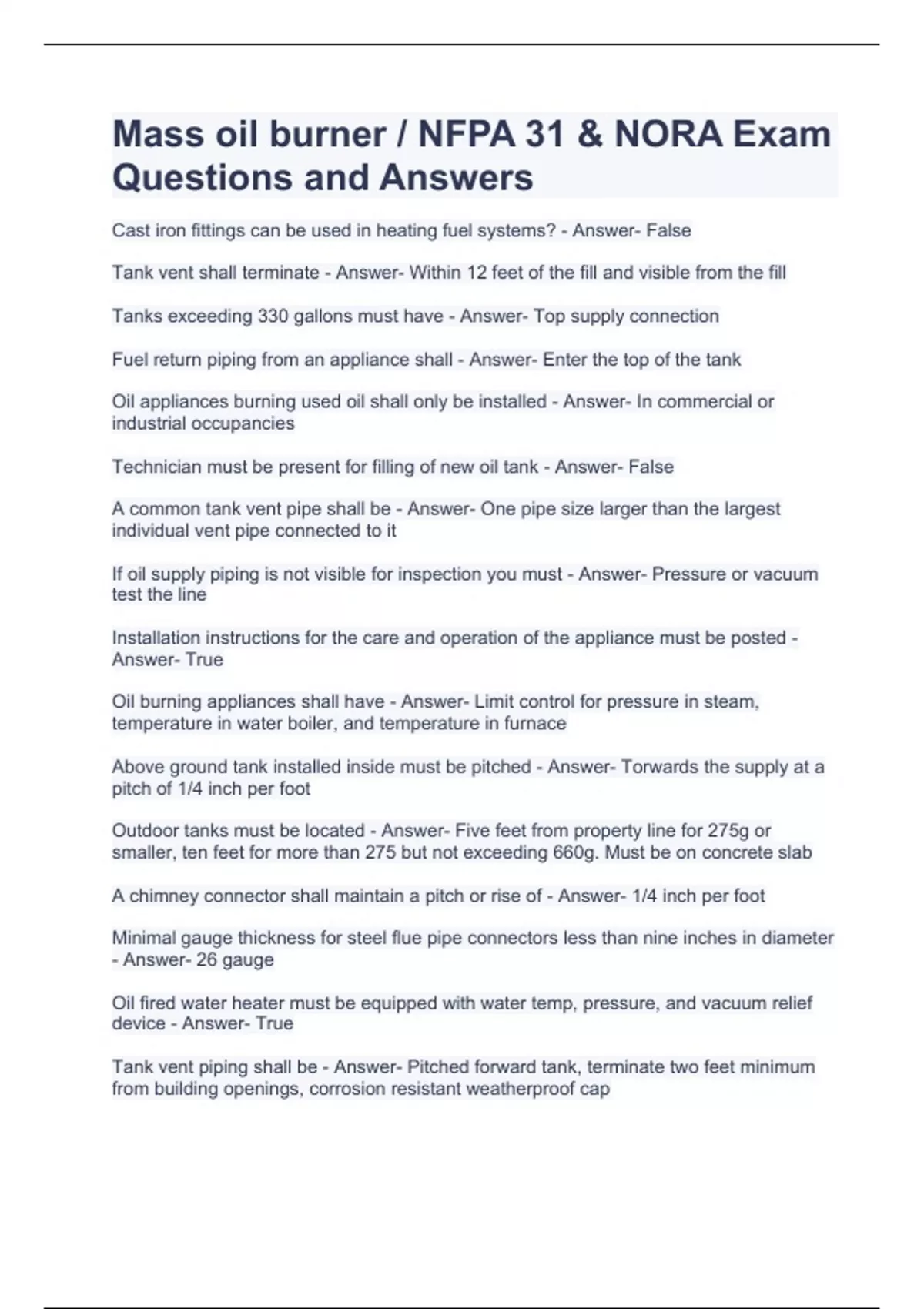 Mass oil burner / NFPA 31 & NORA Exam Questions and Answers