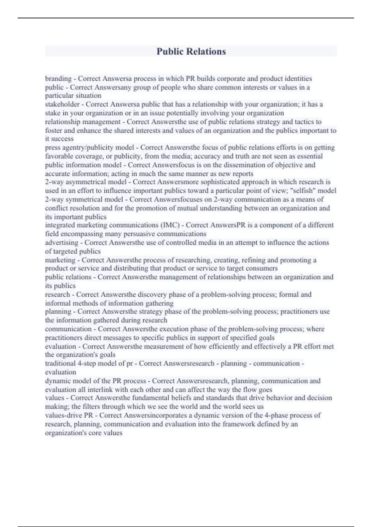 branding - Correct Answersa process in which PR builds corporate and product identities public - Correct Answersany group of people who share common interests or values in a particular situation stakeholder - Correct Answersa public that has a relationship with your organization; it has a stake in your organization or in an issue potentially involving your organization relationship management - Correct Answersthe use of public relations strategy and tactics to foster and enhance the shared interests and values of an organization and the publics important to it success press agentry/publicity model - Correct Answersthe focus of public relations efforts is on getting favorable coverage, or publicity, from the media; accuracy and truth are not seen as essential public information model - Correct Answersfocus is on the dissemination of objective and accurate information; acting in much the same manner as new reports 2-way asymmetrical model - Correct Answersmore sophisticated approach in which research is used in an effort to influence important publics toward a particular point of view; "selfish" model 2-way symmetrical model - Correct Answersfocuses on 2-way communication as a means of conflict resolution and for the promotion of mutual understanding between an organization and its important publics integrated marketing communications (IMC) - Correct AnswersPR is a component of a different field encompassing many persuasive communications advertising - Correct Answersthe use of controlled media in an attempt to influence the actions of targeted publics marketing - Correct Answersthe process of researching, creating, refining and promoting a product or service and distributing that product or service to target consumers public relations - Correct Answersthe management of relationships between an organization and its publics research - Correct Answersthe discovery phase of a problem-solving process; formal and informal methods of information gathering planning - Correct Answersthe strategy phase of the problem-solving process; practitioners use the information gathered during research communication - Correct Answersthe execution phase of the problem-solving process; where practitioners direct messages to specific publics in support of specified goals evaluation - Correct Answersthe measurement of how efficiently and effectively a PR effort met the organization's goals traditional 4-step model of pr - Correct Answersresearch - planning - communication - evaluation dynamic model of the PR process - Correct Answersresearch, planning, communication and evaluation all interlink with each other and can affect the way the flow goes values - Correct Answersthe fundamental beliefs and standards that drive behavior and decision making; the filters through which we see the world and the world sees us values-drive PR - Correct Answersincorporates a dynamic version of the 4-phase process of research, planning, communication and evaluation into the framework defined by an organization's core values
