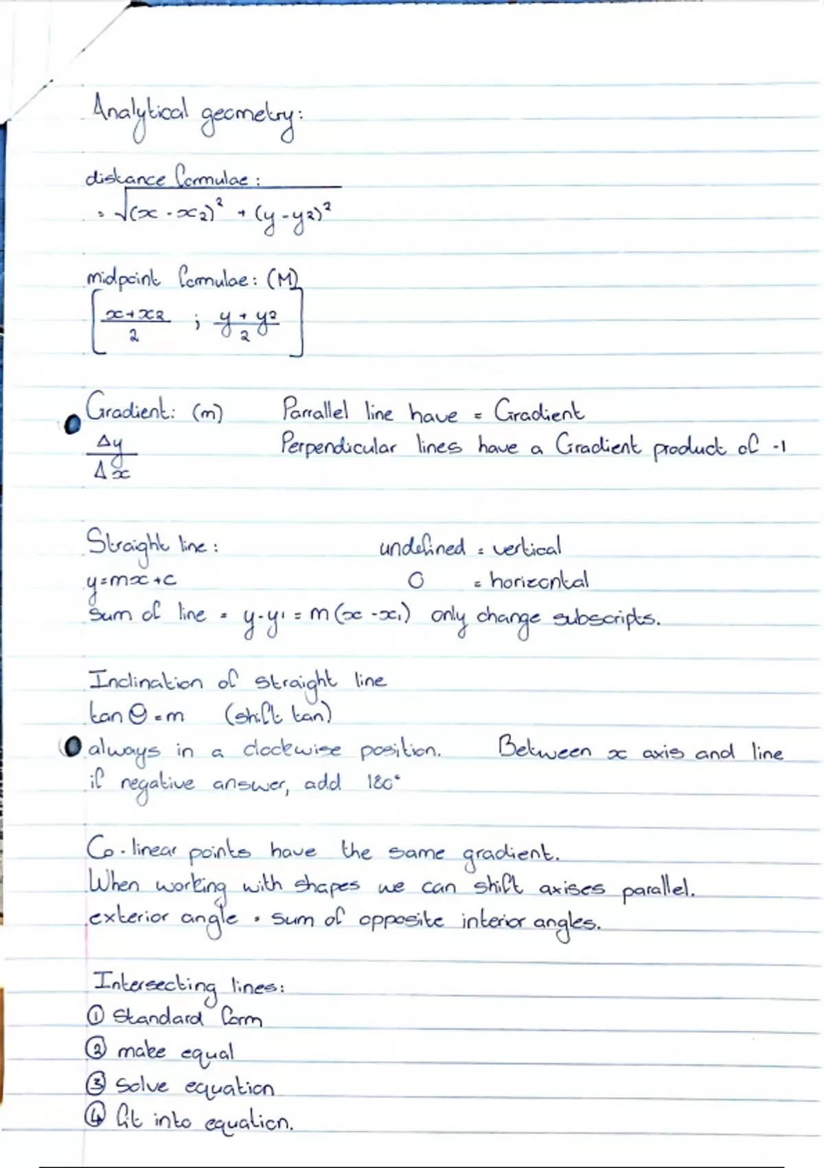 Summary of Analytical geometry equations, midpoint, gradient, inclination of a straight line, co-linear points, intersecting points, shapes, and trigonometry.