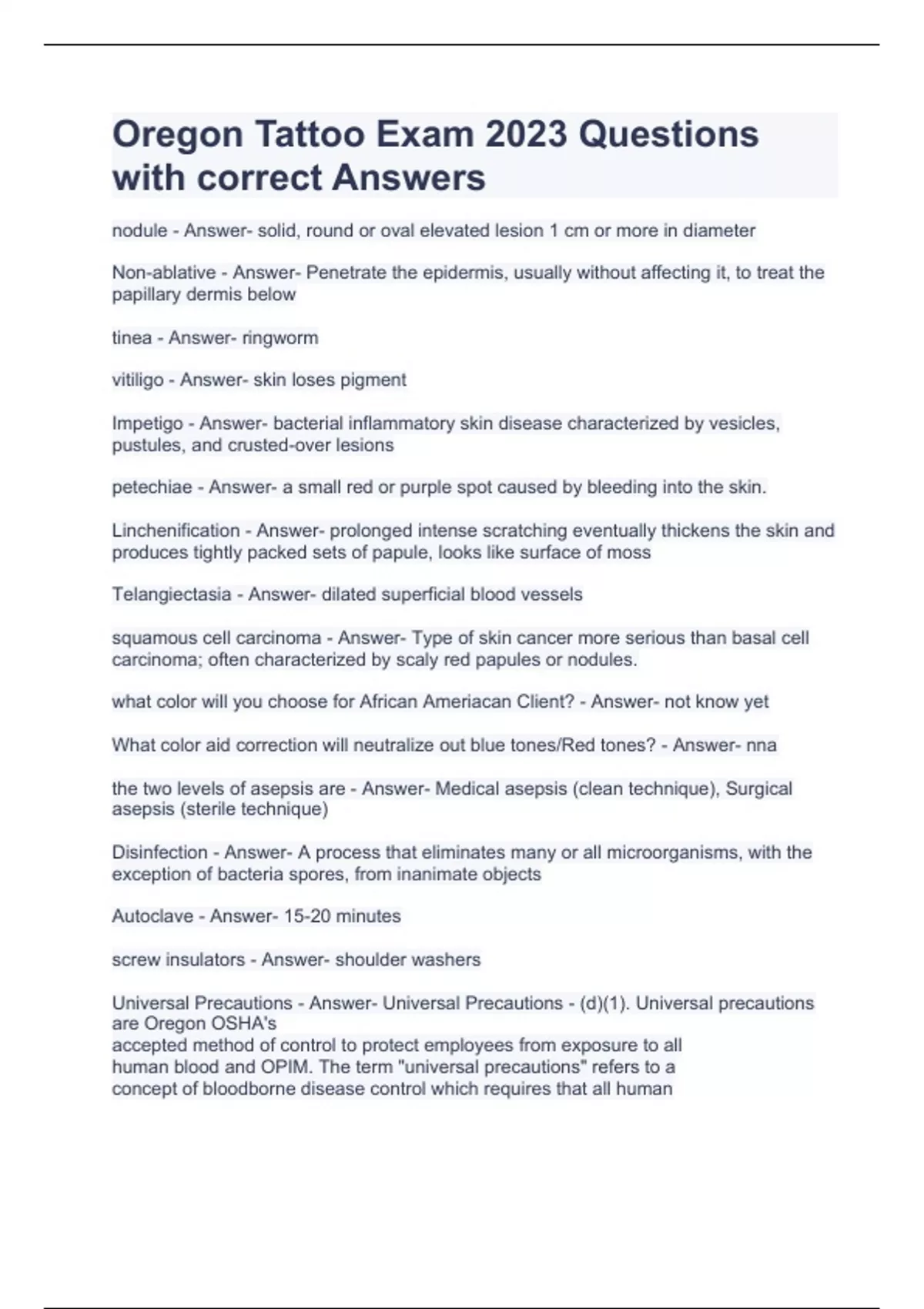nodule - Answer- solid, round or oval elevated lesion 1 cm or more in diameter Non-ablative - Answer- Penetrate the epidermis, usually without affecting it, to treat the papillary dermis below tinea - Answer- ringworm vitiligo - Answer- skin loses pigment Impetigo - Answer- bacterial inflammatory skin disease characterized by vesicles, pustules, and crusted-over lesions petechiae - Answer- a small red or purple spot caused by bleeding into the skin. Linchenification - Answer- prolonged intense scratching eventually thickens the skin and produces tightly packed sets of papule, looks like surface of moss Telangiectasia - Answer- dilated superficial blood vessels squamous cell carcinoma - Answer- Type of skin cancer more serious than basal cell carcinoma; often characterized by scaly red papules or nodules. what color will you choose for African Ameriacan Client? - Answer- not know yet What color aid correction will neutralize out blue tones/Red tones? - Answer- nna the two levels of asepsis are - Answer- Medical asepsis (clean technique), Surgical asepsis (sterile technique) Disinfection - Answer- A process that eliminates many or all microorganisms, with the exception of bacteria spores, from inanimate objects Autoclave - Answer- 15-20 minutes screw insulators - Answer- shoulder washers Universal Precautions - Answer- Universal Precautions - (d)(1). Universal precautions are Oregon OSHA's accepted method of control to protect employees from exposure to all human blood and OPIM. The term "universal precautions" refers to a concept of bloodborne disease control which requires that all human blood and OPIM be treated as if known to be infectious for HIV, HBV, or other bloodborne pathogens regardless of the perceived "low risk" of a patient or patient population. Standard Precautions. - Answer- Alternative concepts in infection control are called Body Substance Isolation (BSI) and Standard Precautions. These methods define all body fluids and substances as infectious. These methods incorporate not only the fluids and materials covered by this standard, but expand coverage to include all body fluids and substances. These concepts are acceptable alternatives to universal precaution