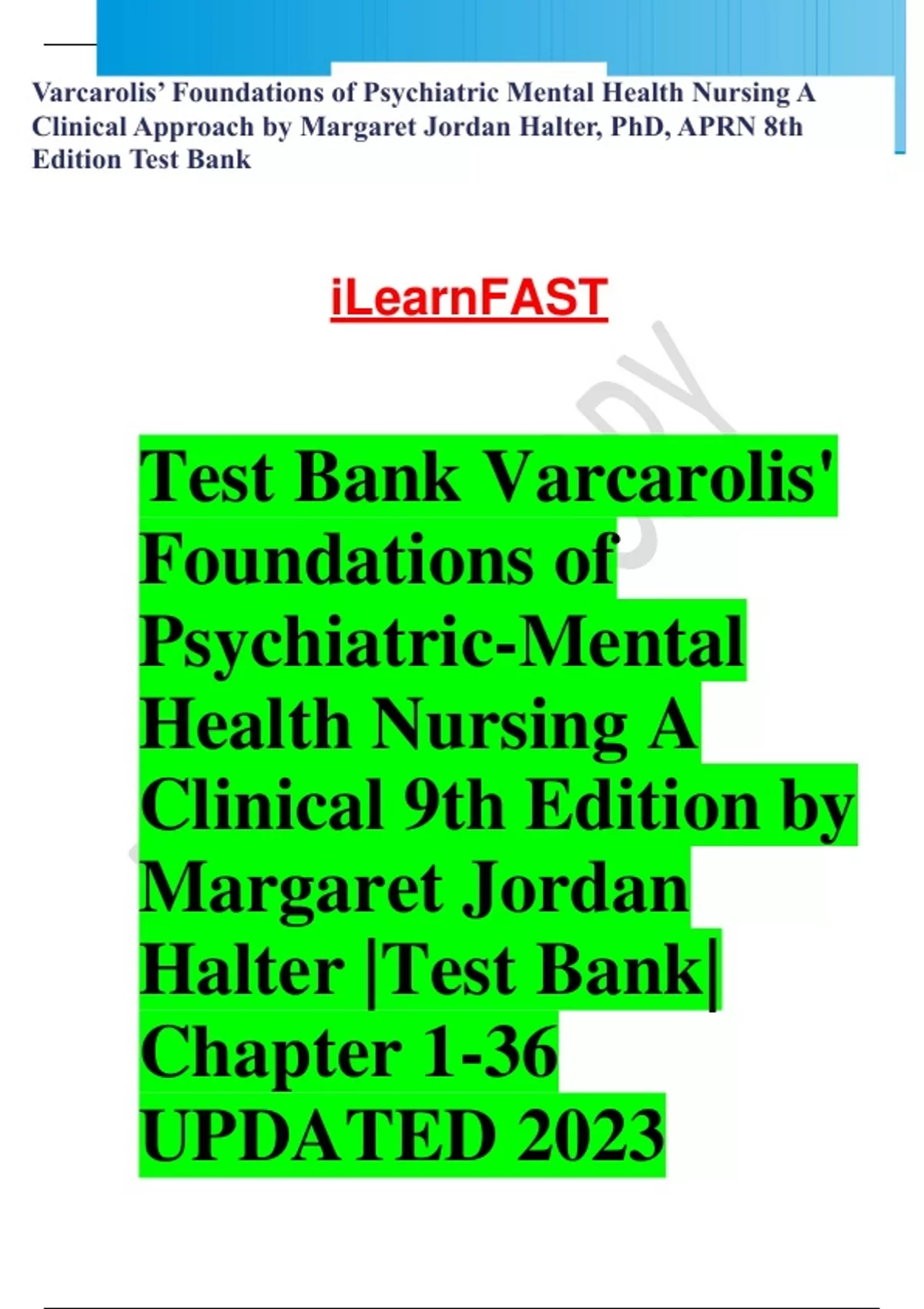 Halter: Varcarolis’ Foundations of Psychiatric Mental Health Nursing: A Clinical Approach, 8th Edition Test Bank Complete Guide A+ Varcarolis’ Foundations of Psychiatric Mental Health Nursing A Clinical Approach by Margaret Jordan Halter, PhD, APRN 8th Edition Test Bank Varcarolis’ Foundations of Psychiatric Mental Health Nursing: A Clinical Approach, by Margaret Jordan Halter, PhD, APRN 8th Edition Test Bank for Varcarolis’ Foundations of Psychiatric Mental Health Nursing A Clinical Approach 8th Edition by Margaret Jordan Halter Test Bank for Varcarolis' Foundations of Psychiatric-Mental Health Nursing, 8th Edition by Margaret Jordan Halter Chapter 01: Mental Health and Mental Illness MULTIPLE CHOICE 1. A staff nurse completes orientation to a psychiatric unit. This nurse may expect an advanced practice nurse to perform which additional intervention? a. Conduct mental health assessments. b. Prescribe psychotropic medication. c. Establish therapeutic relationships. d. Individualize nursing care plans. ANS: In most states, prescriptive privileges are granted to master’s-prepared nurse practitioners and clinical nurse specialists who have taken special courses on prescribing medication. The nurse prepared at the basic level is permitted to perform mental health assessments, establish relationships, and provide individualized care planning. PTS: 1 DIF: Cognitive Level: Understand (Comprehension) REF: Page 1-23 TOP: Nursing Process: Implementation MSC: Client Needs: Safe, Effective Care Environment 2. A nursing student expresses concerns that mental health nurses “lose all their clinical nursing skills.” Select the best response by the mental health nurse. a. “Psychiatric nurses practice in safer environments than other specialties. Nurse-to-patient ratios must be better because of the nature of the patients’ problems.” b. “Psychiatric nurses use complex communication skills as well as critical thinking to solve multidimensional problems. I am challenged by those situations.” c. “That’s a misconception. Psychiatric nurses frequently use high technology monitoring equipment and manage complex intravenous therapies.” d. “Psychiatric nurses do not have to deal with as much pain and suffering as medical– surgical nurses do. That appeals to me.” ANS: The practice of psychiatric nursing requires a different set of skills than medical–surgical nursing, though there is substantial overlap. Psychiatric nurses must be able to help patients with medical as well as mental health problems, reflecting the holistic perspective these nurses must have. Nurse–patient ratios and workloads in psychiatric settings have increased, just like other specialties. Psychiatric nursing involves clinical practice, not just documentation.