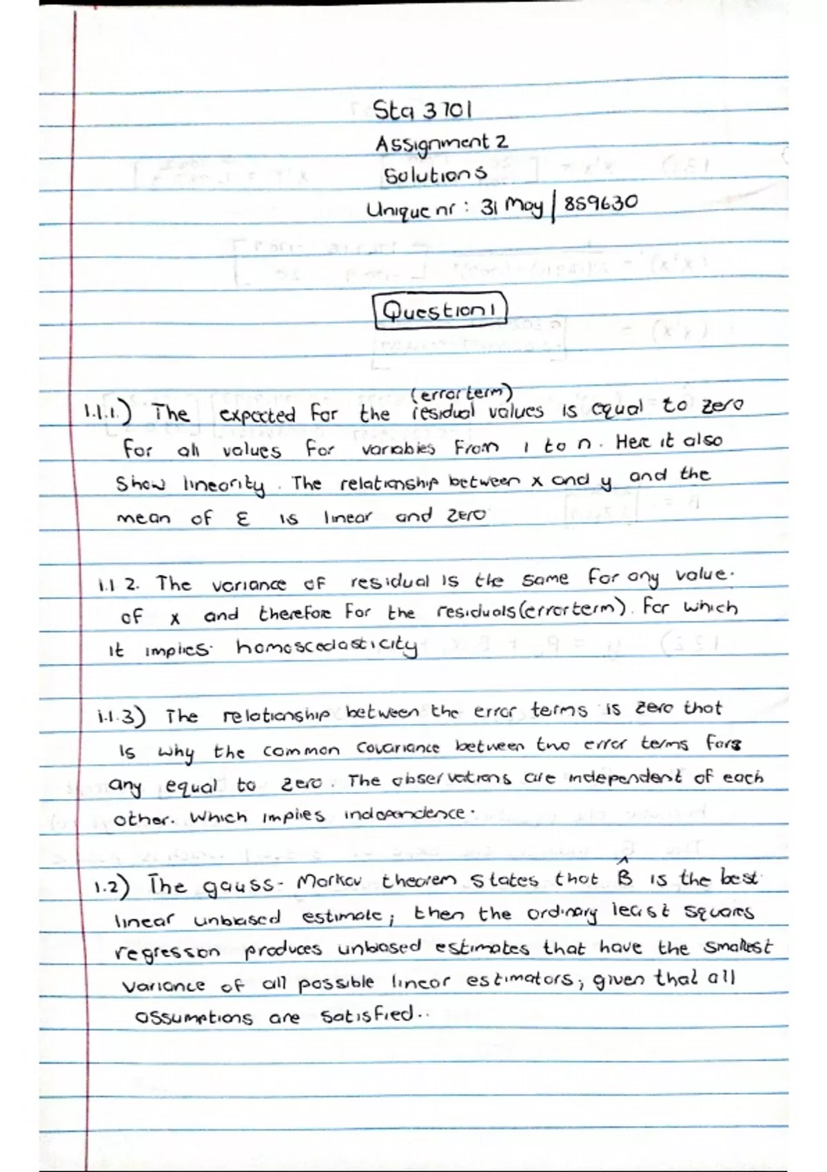 Sta3701 assignment 2 solutions 2023 unisa. A excellent solutions document that took a long time to do and accurately. The only question that could not be done is 2.9. Which I have never heard of. But it's 8 Marks out 110. But everything else is hundred and will help you a lot to ace this topic and multiple regression. Good marks guaranteed