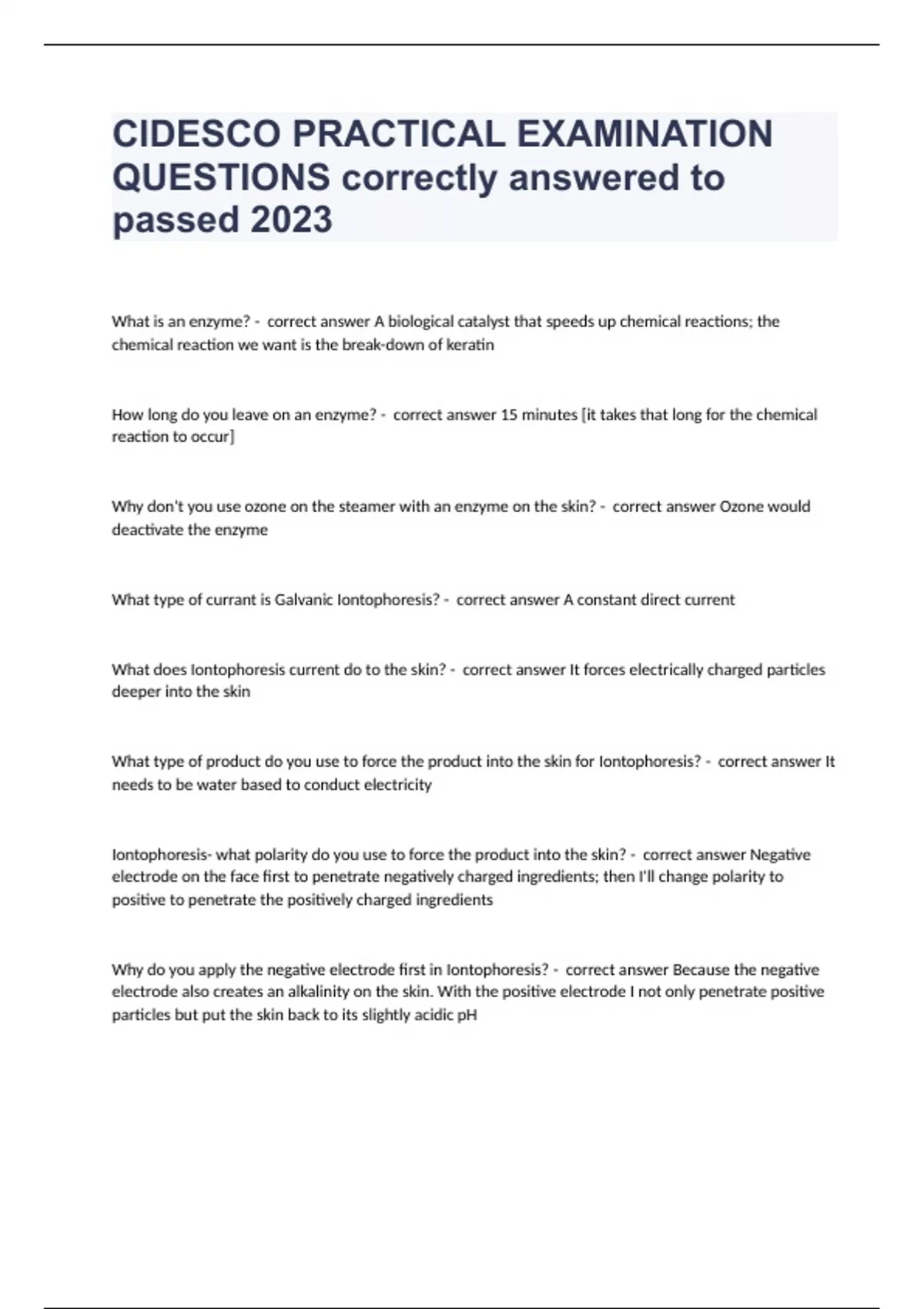CIDESCO PRACTICAL EXAMINATION QUESTIONS correctly answered to passed 2023What is an enzyme? - correct answer A biological catalyst that speeds up chemical reactions; the chemical reaction we want is the break-down of keratin How long do you leave on an enzyme? - correct answer 15 minutes [it takes that long for the chemical reaction to occur] Why don't you use ozone on the steamer with an enzyme on the skin? - correct answer Ozone would deactivate the enzyme What type of currant is Galvanic Iontophoresis? - correct answer A constant direct current What does Iontophoresis current do to the skin? - correct answer It forces electrically charged particles deeper into the skin What type of product do you use to force the product into the skin for Iontophoresis? - correct answer It needs to be water based to conduct electricity Iontophoresis- what polarity do you use to force the product into the skin? - correct answer Negative electrode on the face first to penetrate negatively charged ingredients; then I'll change polarity to positive to penetrate the positively charged ingredients Why do you apply the negative electrode first in Iontophoresis? - correct answer Because the negative electrode also creates an alkalinity on the skin. With the positive electrode I not only penetrate positive particles but put the skin back to its slightly acidic pH How does the client benefit from Iontophoresis? - correct answer The ingredients will arrive deeper in