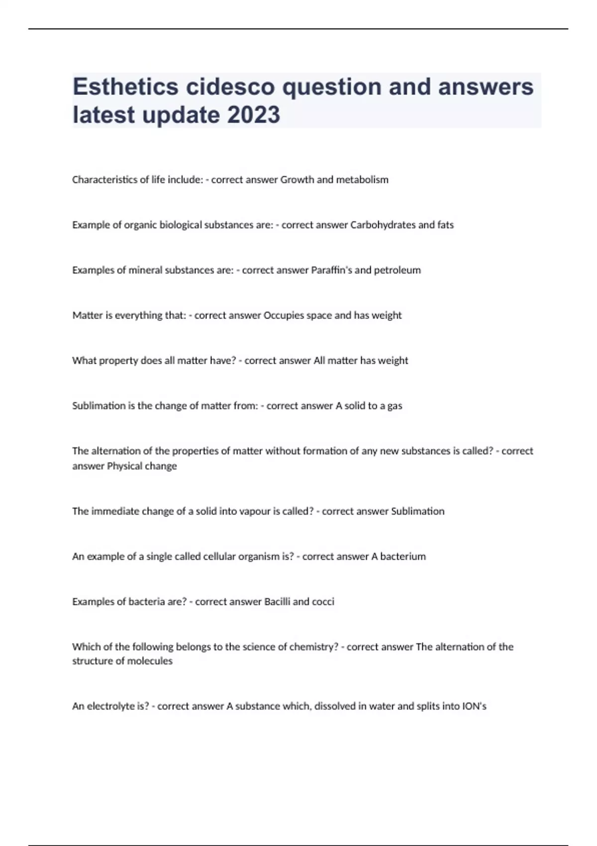 Esthetics cidesco question and answers latest update 2023 Characteristics of life include: - correct answer Growth and metabolism Example of organic biological substances are: - correct answer Carbohydrates and fats Examples of mineral substances are: - correct answer Paraffin's and petroleum Matter is everything that: - correct answer Occupies space and has weight What property does all matter have? - correct answer All matter has weight Sublimation is the change of matter from: - correct answer A solid to a gas The alternation of the properties of matter without formation of any new substances is called? - correct answer Physical change The immediate change of a solid into vapour is called? - correct answer Sublimation An example of a single called cellular organism is? - correct answer A bacterium Examples of bacteria are? - correct answer Bacilli and cocci Which of the following belongs to the science of chemistry? - correct answer The alternation of the structure of molecules An electrolyte is? - correct answer A substance which, dissolved in water and splits into ION's
