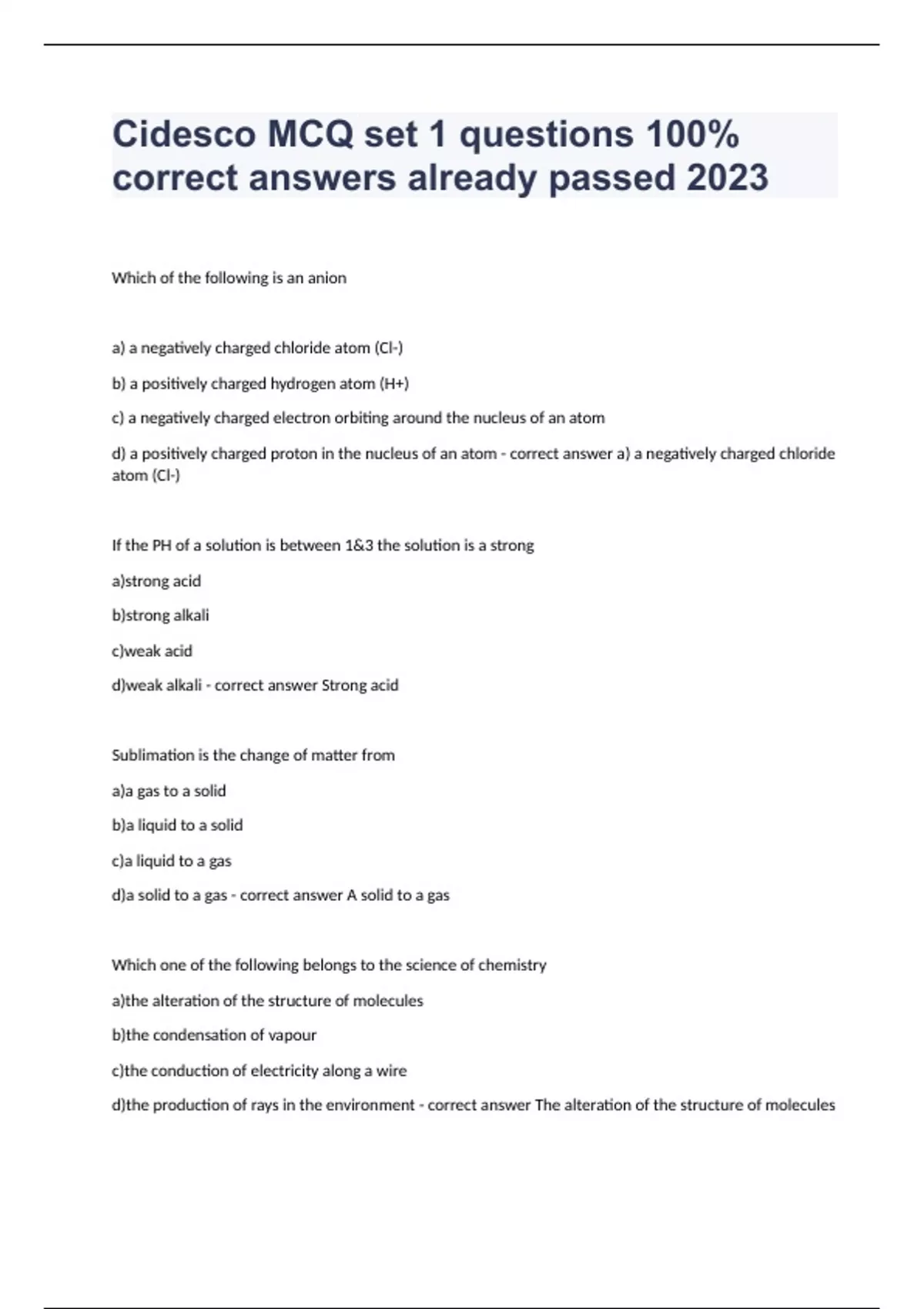 Cidesco MCQ set 1 questions 100% correct answers already passed 2023Which of the following is an anion a) a negatively charged chloride atom (Cl-) b) a positively charged hydrogen atom (H+) c) a negatively charged electron orbiting around the nucleus of an atom d) a positively charged proton in the nucleus of an atom - correct answer a) a negatively charged chloride atom (Cl-) If the PH of a solution is between 1&3 the solution is a strong a)strong acid b)strong alkali c)weak acid d)weak alkali - correct answer Strong acid Sublimation is the change of matter from a)a gas to a solid b)a liquid to a solid c)a liquid to a gas d)a solid to a gas - correct answer A solid to a gas Which one of the following belongs to the science of chemistry a)the alteration of the structure of molecules b)the condensation of vapour c)the conduction of electricity along a wire d)the production of rays in the environment - correct answer The alteration of the structure of molecules