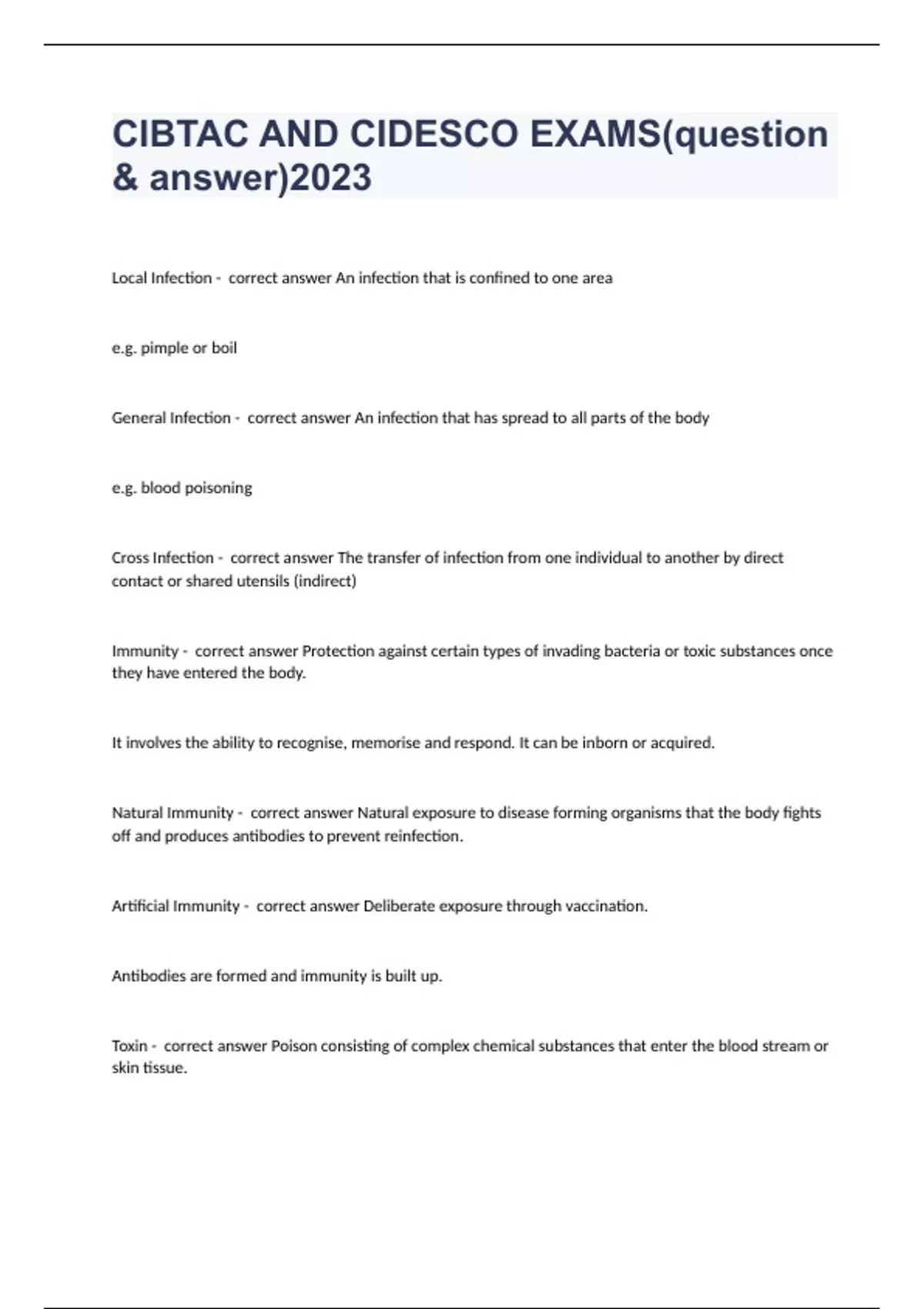 CIBTAC AND CIDESCO EXAMS(question & answer)2023Local Infection - correct answer An infection that is confined to one area e.g. pimple or boil General Infection - correct answer An infection that has spread to all parts of the body e.g. blood poisoning Cross Infection - correct answer The transfer of infection from one individual to another by direct contact or shared utensils (indirect) Immunity - correct answer Protection against certain types of invading bacteria or toxic substances once they have entered the body. It involves the ability to recognise, memorise and respond. It can be inborn or acquired. Natural Immunity - correct answer Natural exposure to disease forming organisms that the body fights off and produces antibodies to prevent reinfection. Artificial Immunity - correct answer Deliberate exposure through vaccination. Antibodies are formed and immunity is built up. Toxin - correct answer Poison consisting of complex chemical substances that enter the blood stream or skin tissue.