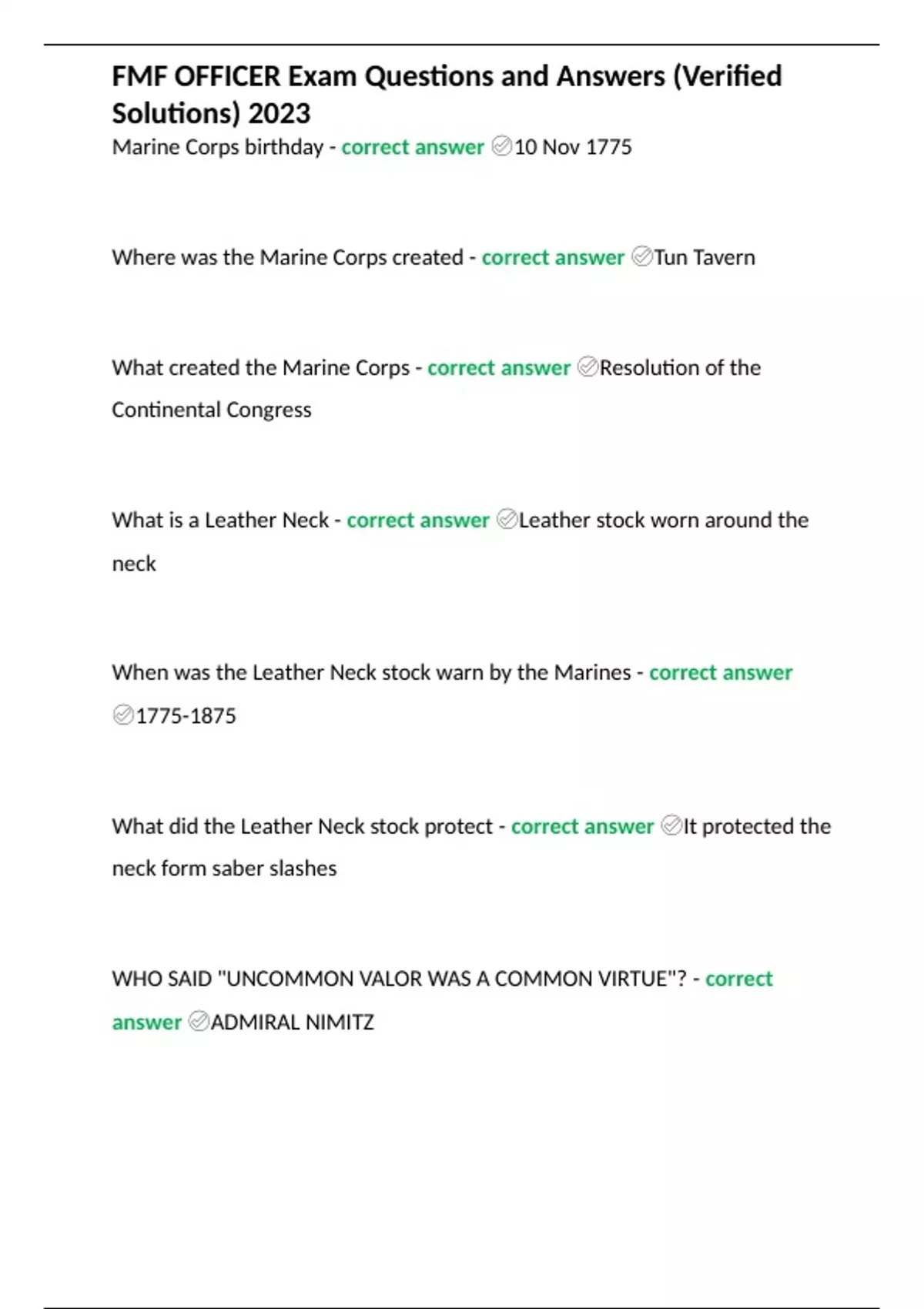 WHO SAID "UNCOMMON VALOR WAS A COMMON VIRTUE"? - correct answer ✅ADMIRAL NIMITZ FMF OFFICER Exam Questions and Answers (Verified Solutions) 2023 DESCRIBE THE FMF DEVICE - correct answer ✅EAGLE,GLOBE, ANCHOR MAKE IS CLEAR THAT THE WARERE IS A MEMBER OF THE NAVY/ MARINE TEAM