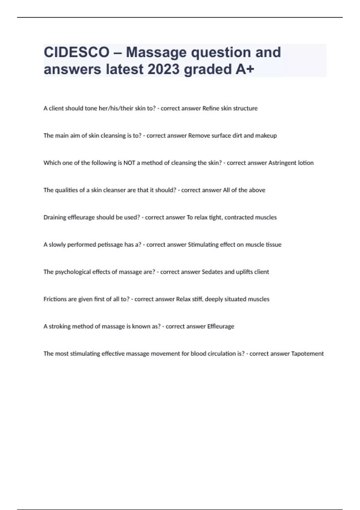 CIDESCO – Massage question and answers latest 2023 graded A+ A client should tone her/his/their skin to? - correct answer Refine skin structure The main aim of skin cleansing is to? - correct answer Remove surface dirt and makeup Which one of the following is NOT a method of cleansing the skin? - correct answer Astringent lotion The qualities of a skin cleanser are that it should? - correct answer All of the above Draining effleurage should be used? - correct answer To relax tight, contracted muscles A slowly performed petissage has a? - correct answer Stimulating effect on muscle tissue The psychological effects of massage are? - correct answer Sedates and uplifts client Frictions are given first of all to? - correct answer Relax stiff, deeply situated muscles A stroking method of massage is known as? - correct answer Effleurage The most stimulating effective massage movement for blood circulation is? - correct answer Tapotement