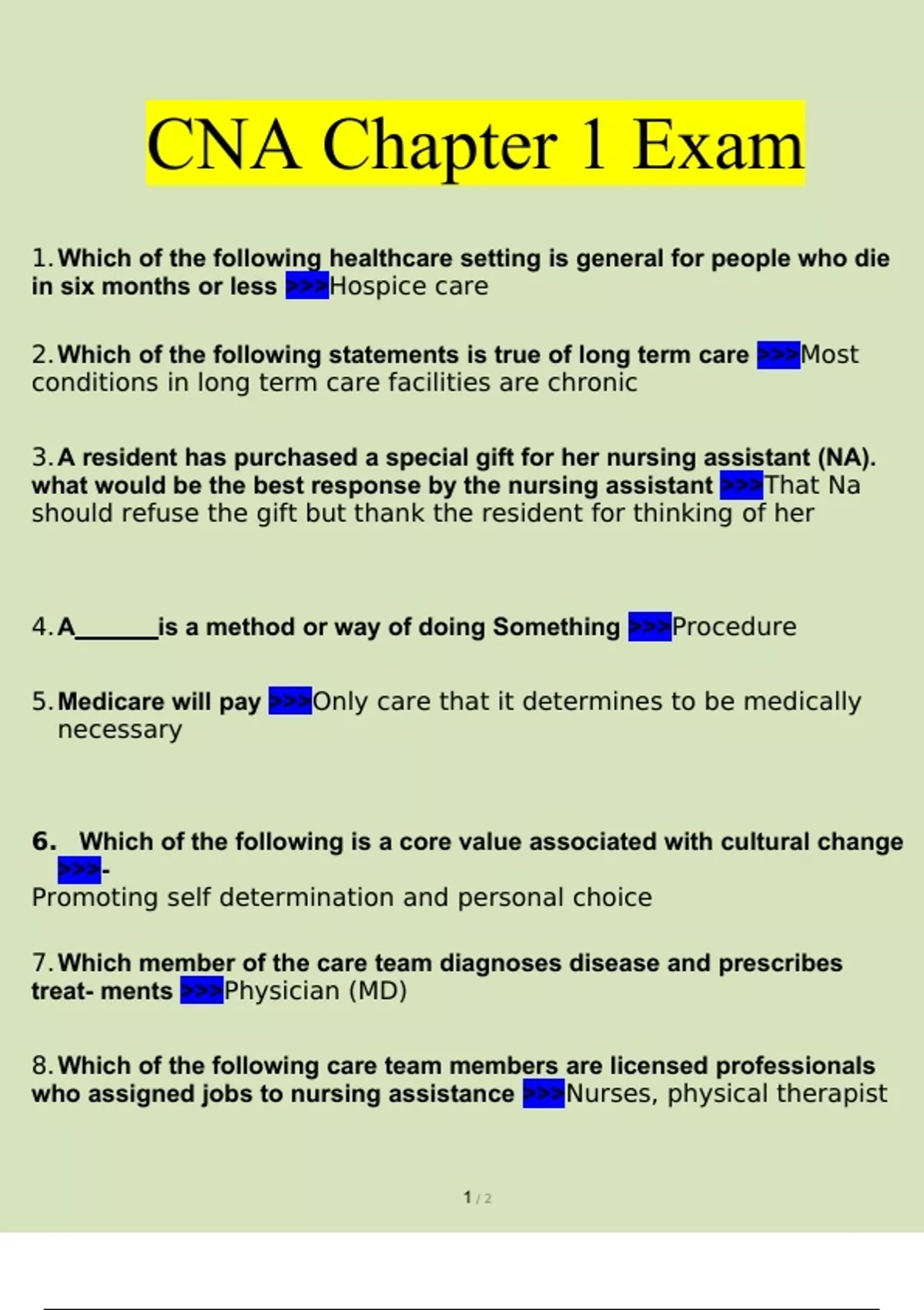 CNA Chapter 1 Exam Questions and Answers 2023 (Verified Answers by Expert) CNA Chapter 1 Exam Questions and Answers 2023 (Verified Answers by Expert)