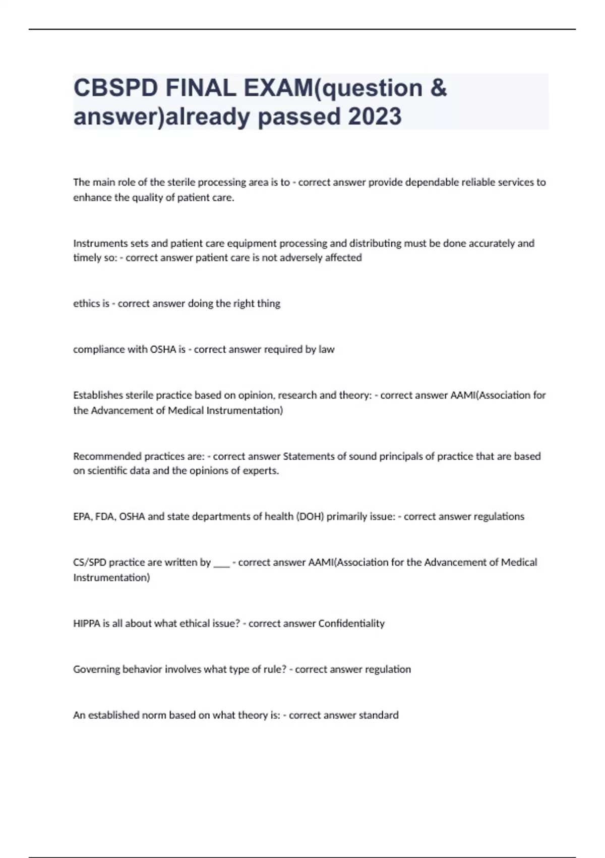CBSPD FINAL EXAM(question & answer)already passed 2023The main role of the sterile processing area is to - correct answer provide dependable reliable services to enhance the quality of patient care. Instruments sets and patient care equipment processing and distributing must be done accurately and timely so: - correct answer patient care is not adversely affected ethics is - correct answer doing the right thing compliance with OSHA is - correct answer required by law Establishes sterile practice based on opinion, research and theory: - correct answer AAMI(Association for the Advancement of Medical Instrumentation) Recommended practices are: - correct answer Statements of sound principals of practice that are based on scientific data and the opinions of experts. EPA, FDA, OSHA and state departments of health (DOH) primarily issue: - correct answer regulations CS/SPD practice are written by ___ - correct answer AAMI(Association for the Advancement of Medical Instrumentation) HIPPA is all about what ethical issue? - correct answer Confidentiality Governing behavior involves what type of rule? - correct answer regulation An established norm based on what theory is: - correct answer standard