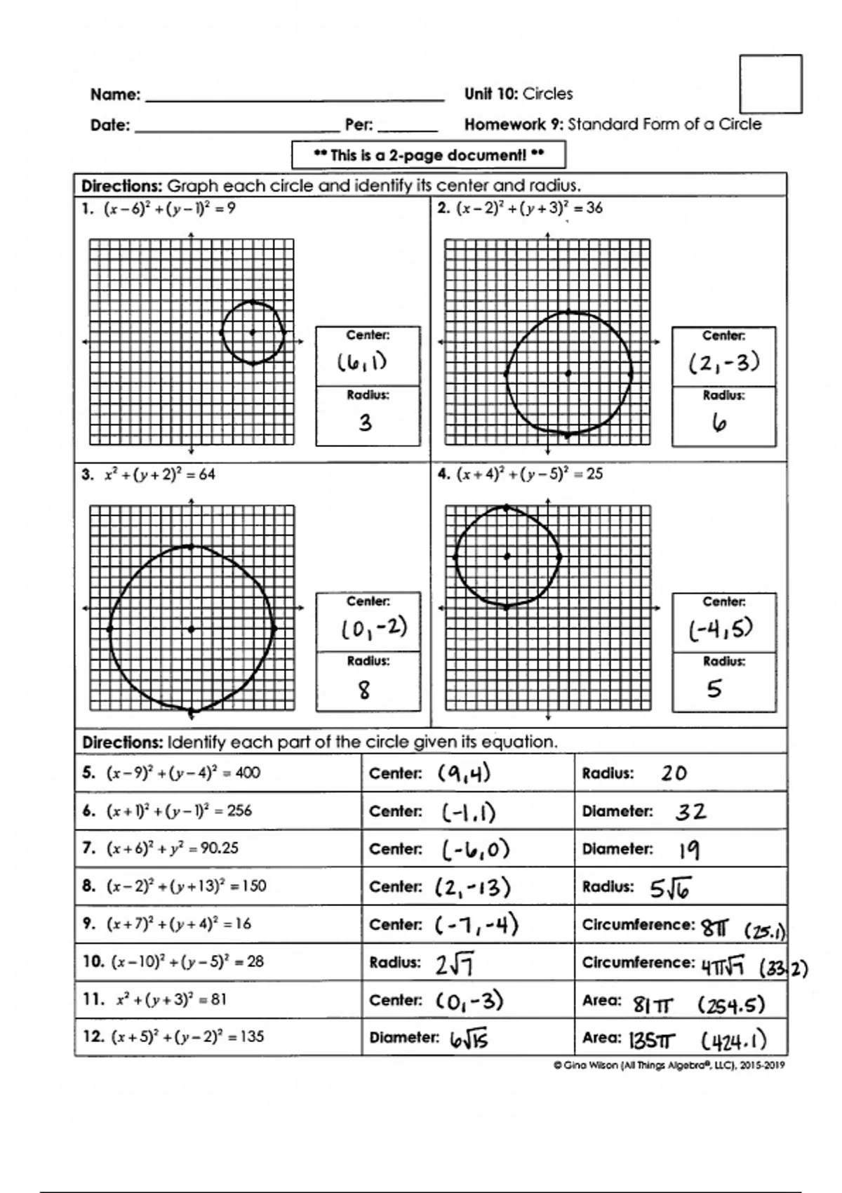 This is class notes on the lesson U10L9 Standard Form of a Circle Solutions Honors.