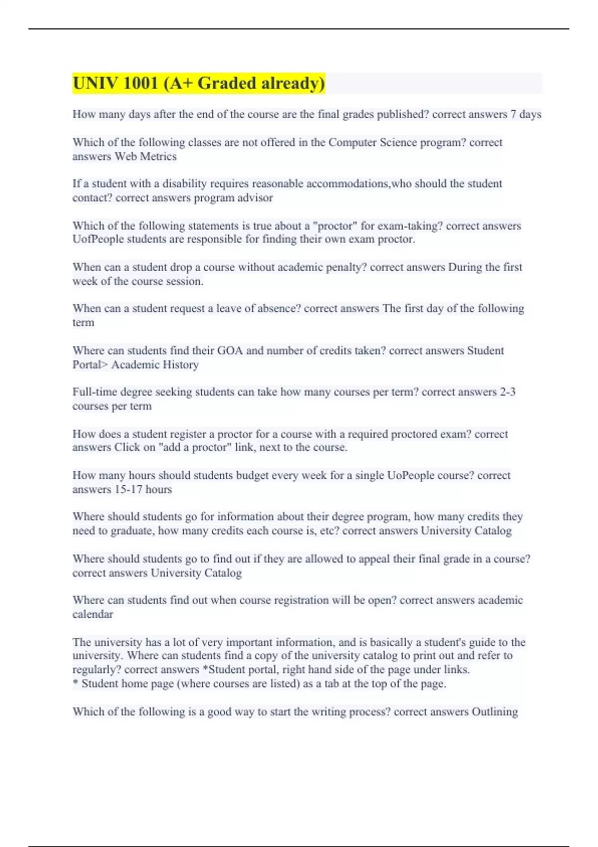 How many days after the end of the course are the final grades published? correct answers 7 days Which of the following classes are not offered in the Computer Science program? correct answers Web Metrics If a student with a disability requires reasonable accommodations,who should the student contact? correct answers program advisor Which of the following statements is true about a "proctor" for exam-taking? correct answers UofPeople students are responsible for finding their own exam proctor. When can a student drop a course without academic penalty? correct answers During the first week of the course session. When can a student request a leave of absence? correct answers The first day of the following term Where can students find their GOA and number of credits taken? correct answers Student Portal Academic History Full-time degree seeking students can take how many courses per term? correct answers 2-3 courses per term How does a student register a proctor for a course with a required proctored exam? correct answers Click on "add a proctor" link, next to the course. How many hours should students budget every week for a single UoPeople course? correct answers 15-17 hours Where should students go for information about their degree program, how many credits they need to graduate, how many credits each course is, etc? correct answers University Catalog Where should students go to find out if they are allowed to appeal their final grade in a course? correct answers University Catalog Where can students find out when course registration will be open? correct answers academic calendar The university has a lot of very important information, and is basically a student's guide to the university. Where can students find a copy of the university catalog to print out and refer to regularly? correct answers *Student portal, right hand side of the page under links. * Student home page (where courses are listed) as a tab at the top of the page. Which of the following is a good way to start the writing process? correct answers Outlining