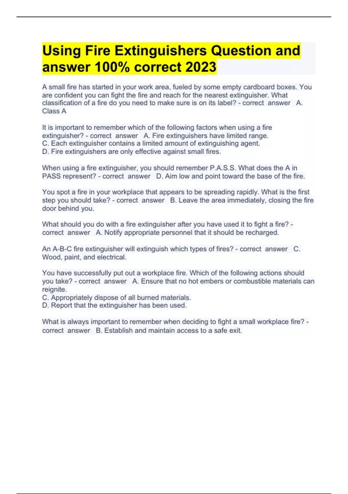 Using Fire Extinguishers Question and answer 100% correct 2023A small fire has started in your work area, fueled by some empty cardboard boxes. You are confident you can fight the fire and reach for the nearest extinguisher. What classification of a fire do you need to make sure is on its label? A. Class A It is important to remember which of the following factors when using a fire extinguisher? A. Fire extinguishers have limited range. C. Each extinguisher contains a limited amount of extinguishing agent. D. Fire extinguishers are only effective against small fires. When using a fire extinguisher, you should remember P.A.S.S. What does the A in PASS represent? D. Aim low and point toward the base of the fire. You spot a fire in your workplace that appears to be spreading rapidly. What is the first step you should take? B. Leave the area immediately, closing the fire door behind you. What should you do with a fire extinguisher after you have used it to fight a fire? A. Notify appropriat