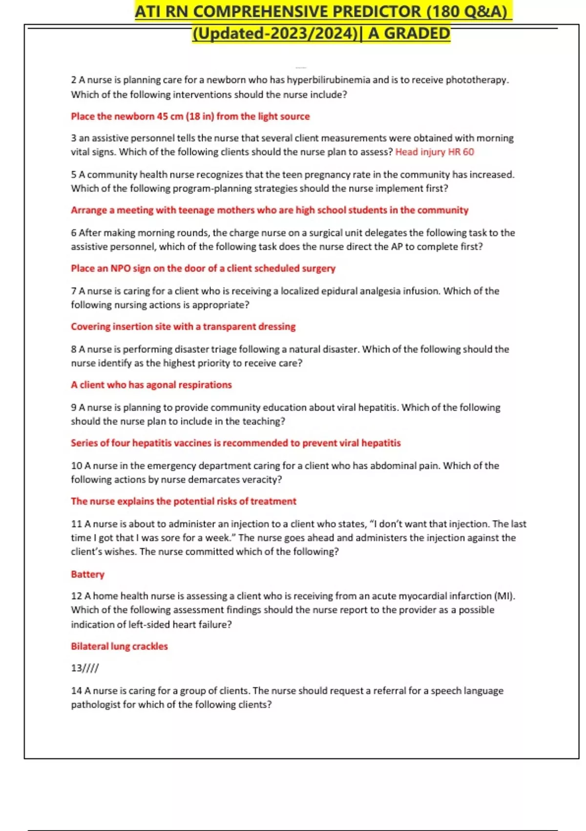 ATI RN COMPREHENSIVE PREDICTOR (180 Q&A) (Updated-2023/2024)| A GRADED