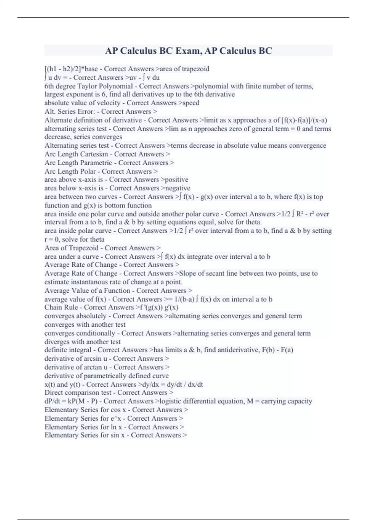 [(h1 - h2)/2]*base - Correct Answers >area of trapezoid ∫ u dv = - Correct Answers >uv - ∫ v du 6th degree Taylor Polynomial - Correct Answers >polynomial with finite number of terms, largest exponent is 6, find all derivatives up to the 6th derivative absolute value of velocity - Correct Answers >speed Alt. Series Error: - Correct Answers > Alternate definition of derivative - Correct Answers >limit as x approaches a of [f(x)-f(a)]/(x-a) alternating series test - Correct Answers >lim as n approaches zero of general term = 0 and terms decrease, series converges Alternating series test - Correct Answers >terms decrease in absolute value means convergence Arc Length Cartesian - Correct Answers > Arc Length Parametric - Correct Answers > Arc Length Polar - Correct Answers > area above x-axis is - Correct Answers >positive area below x-axis is - Correct Answers >negative area between two curves - Correct Answers >∫ f(x) - g(x) over interval a to b, where f(x) is top function and g(x) is bottom function area inside one polar curve and outside another polar curve - Correct Answers >1/2 ∫ R² - r² over interval from a to b, find a & b by setting equations equal, solve for theta. area inside polar curve - Correct Answers >1/2 ∫ r² over interval from a to b, find a & b by setting r = 0, solve for theta Area of Trapezoid - Correct Answers > area under a curve - Correct Answers >∫ f(x) dx integrate over interval a to b Average Rate of Change - Correct Answers > Average Rate of Change - Correct Answers >Slope of secant line between two points, use to estimate instantanous rate of change at a point. Average Value of a Function - Correct Answers > average value of f(x) - Correct Answers >= 1/(b-a) ∫ f(x) dx on interval a to b Chain Rule - Correct Answers >f '(g(x)) g'(x) converges absolutely - Correct Answers >alternating series converges and general term converges with another test converges conditionally - Correct Answers >alternating series converges and general term diverges with another test definite integral - Correct Answers >has limits a & b, find antiderivative, F(b) - F(a) derivative of arcsin u - Correct Answers > derivative of arctan u - Correct Answers > derivative of parametrically defined curve x(t) and y(t) - Correct Answers >dy/dx = dy/dt / dx/dt Direct comparison test - Correct Answers > dP/dt = kP(M - P) - Correct Answers >logistic differential equation, M = carrying capacity Elementary Series for cos x - Correct Answers > Elementary Series for e^x - Correct Answers > Elementary Series for ln x - Correct Answers > Elementary Series for sin x - Correct Answers >