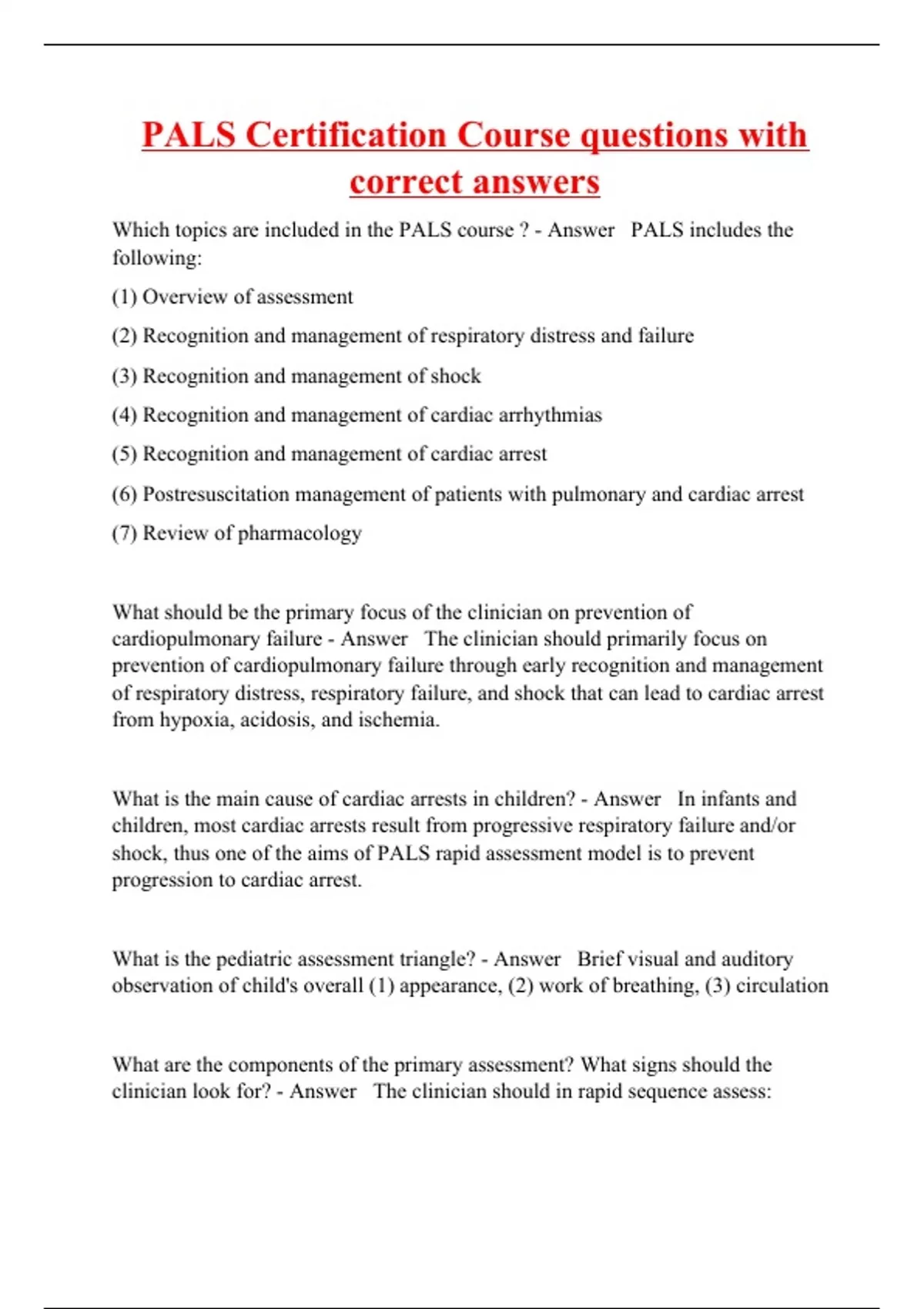 Which topics are included in the PALS course ? - Answer PALS includes the following: (1) Overview of assessment (2) Recognition and management of respiratory distress and failure (3) Recognition and management of shock (4) Recognition and management of cardiac arrhythmias (5) Recognition and management of cardiac arrest (6) Postresuscitation management of patients with pulmonary and cardiac arrest (7) Review of pharmacology What should be the primary focus of the clinician on prevention of cardiopulmonary failure - Answer The clinician should primarily focus on prevention of cardiopulmonary failure through early recognition and management of respiratory distress, respiratory failure, and shock that can lead to cardiac arrest from hypoxia, acidosis, and ischemia. What is the main cause of cardiac arrests in children? - Answer In infants and children, most cardiac arrests result from progressive respiratory failure and/or shock, thus one of the aims of PALS rapid assessment model is to prevent progression to cardiac arrest. What is the pediatric assessment triangle? - Answer Brief visual and auditory observation of child's overall (1) appearance, (2) work of breathing, (3) circulation What are the components of the primary assessment? What signs should the clinician look for? - Answer The clinician should in rapid