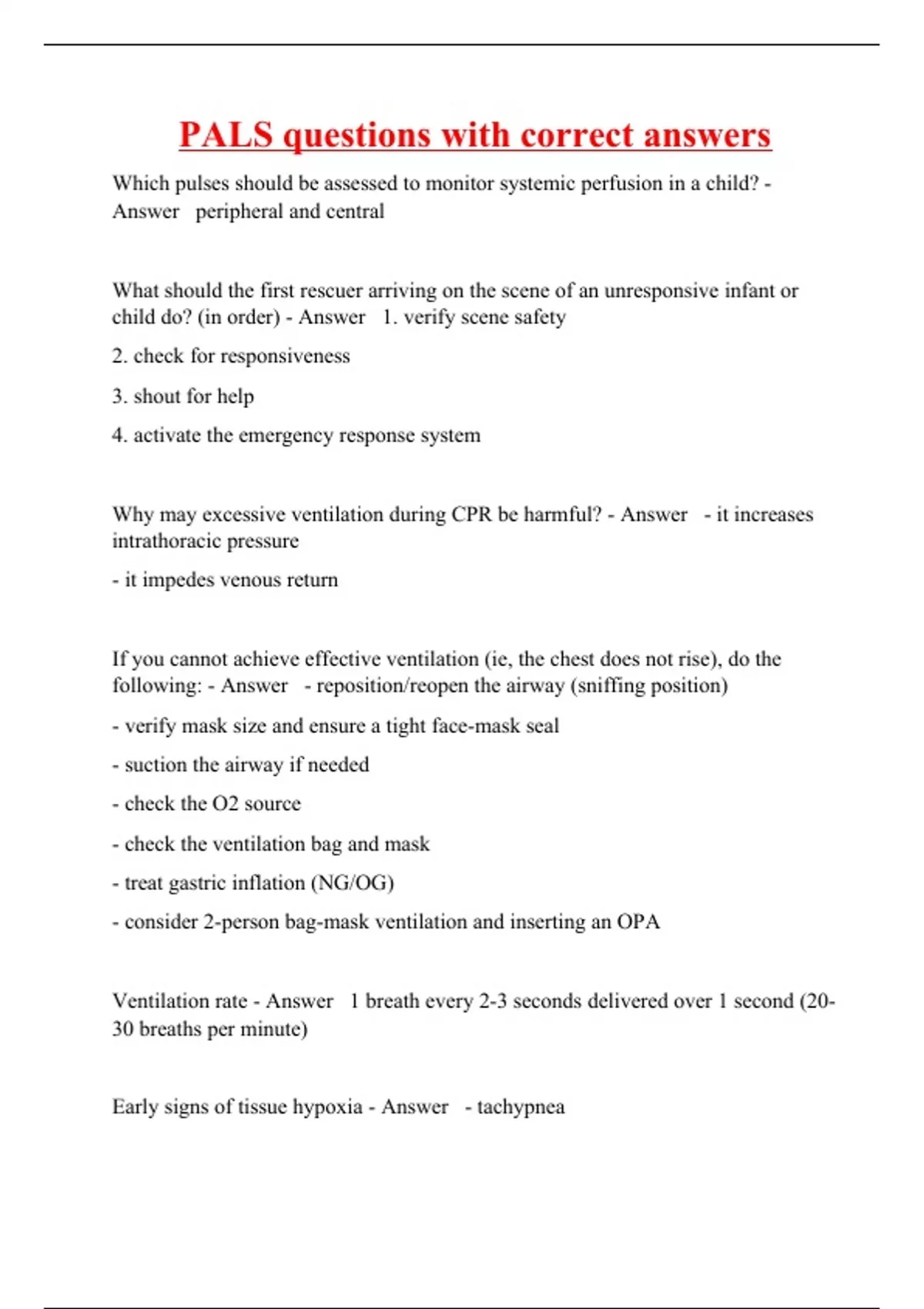 Which pulses should be assessed to monitor systemic perfusion in a child? - Answer peripheral and central What should the first rescuer arriving on the scene of an unresponsive infant or child do? (in order) - Answer 1. verify scene safety 2. check for responsiveness 3. shout for help 4. activate the emergency response system Why may excessive ventilation during CPR be harmful? - Answer - it increases intrathoracic pressure - it impedes venous return If you cannot achieve effective ventilation (ie, the chest does not rise), do the following: - Answer - reposition/reopen the airway (sniffing position) - verify mask size and ensure a tight face-mask seal - suction the airway if needed - check the O2 source - check the ventilation bag and mask - treat gastric inflation (NG/OG) - consider 2-person bag-mask ventilation and inserting an OPA Ventilation rate - Answer 1 breath every 2-3 seconds delivered over 1 second (20-30 breaths per minute)