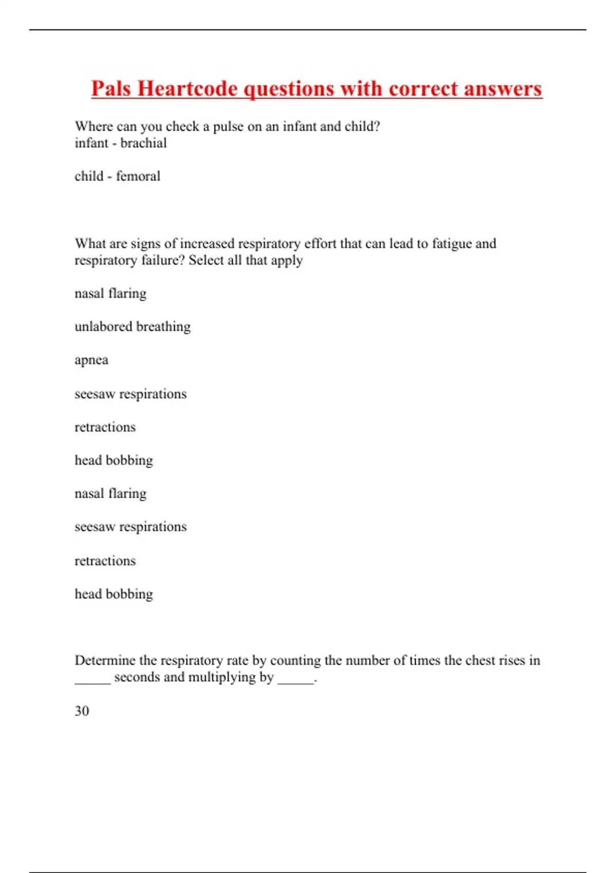 Where can you check a pulse on an infant and child? infant - brachial child - femoral What are signs of increased respiratory effort that can lead to fatigue and respiratory failure? Select all that apply nasal flaring unlabored breathing apnea seesaw respirations retractions head bobbing nasal flaring seesaw respirations retractions head bobbing Determine the respiratory rate by counting the number of times the chest rises in _____ seconds and multiplying by _____.