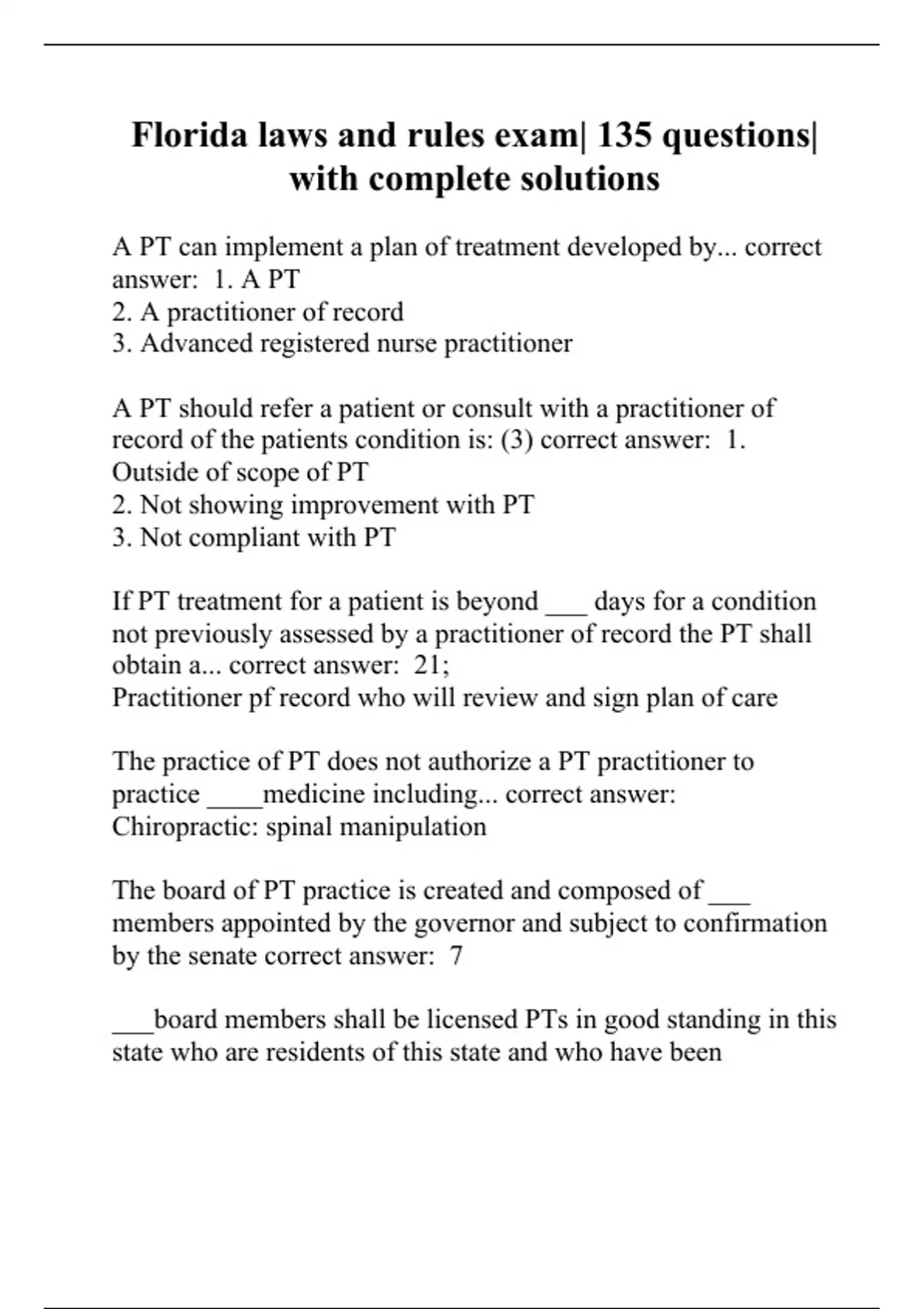 A PT can implement a plan of treatment developed by... correct answer: 1. A PT 2. A practitioner of record 3. Advanced registered nurse practitioner A PT should refer a patient or consult with a practitioner of record of the patients condition is: (3) correct answer: 1. Outside of scope of PT 2. Not showing improvement with PT 3. Not compliant with PT If PT treatment for a patient is beyond ___ days for a condition not previously assessed by a practitioner of record the PT shall obtain a... correct answer: 21; Practitioner pf record who will review and sign plan of care The practice of PT does not authorize a PT practitioner to practice ____medicine including... correct answer: Chiropractic: spinal manipulation The board of PT practice is created and composed of ___ members appointed by the governor and subject to confirmation by the senate correct answer: 7 ___board members shall be licensed PTs in good standing in this state who are residents of this state and who have been practicing PT for ___years immediately prior to their appointment. correct answer: 5 4 The two remaining board members shall be residence of the state but do not have to be... correct answer: Licensed health care practitioners As board members expire the governor shall appoint successors for terms of __ years, and such members shall serve until their successors are appointed correct answer: 4 What are the duties of the board of PT (5) correct answer: 1. Administer oath 2. Summon witnesses 3. Take testimony in all matters 4. Establish minimum standards of practice and afoot rules 5. Review the standing of any school or college offering courses in PT to determine if they meet the standard What are PT requirements for licensure (4) correct answer: 1. 18 years or older 2. Good moral character 3. Graduated from accredited PT school