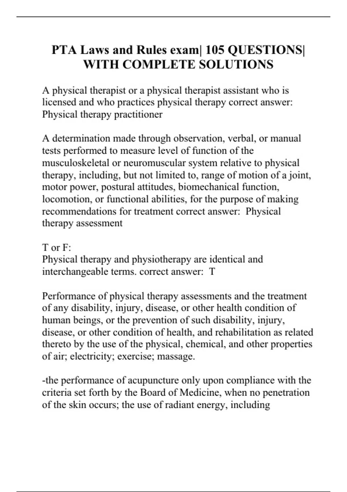 A physical therapist or a physical therapist assistant who is licensed and who practices physical therapy correct answer: Physical therapy practitioner A determination made through observation, verbal, or manual tests performed to measure level of function of the musculoskeletal or neuromuscular system relative to physical therapy, including, but not limited to, range of motion of a joint, motor power, postural attitudes, biomechanical function, locomotion, or functional abilities, for the purpose of making recommendations for treatment correct answer: Physical therapy assessment T or F: Physical therapy and physiotherapy are identical and interchangeable terms. correct answer: T Performance of physical therapy assessments and the treatment of any disability, injury, disease, or other health condition of human beings, or the prevention of such disability, injury, disease, or other condition of health, and rehabilitation as related thereto by the use of the physical, chemical, and other properties of air; electricity; exercise; massage. -the performance of acupuncture only upon compliance with the criteria set forth by the Board of Medicine, when no penetration of the skin occurs; the use of radiant energy, including