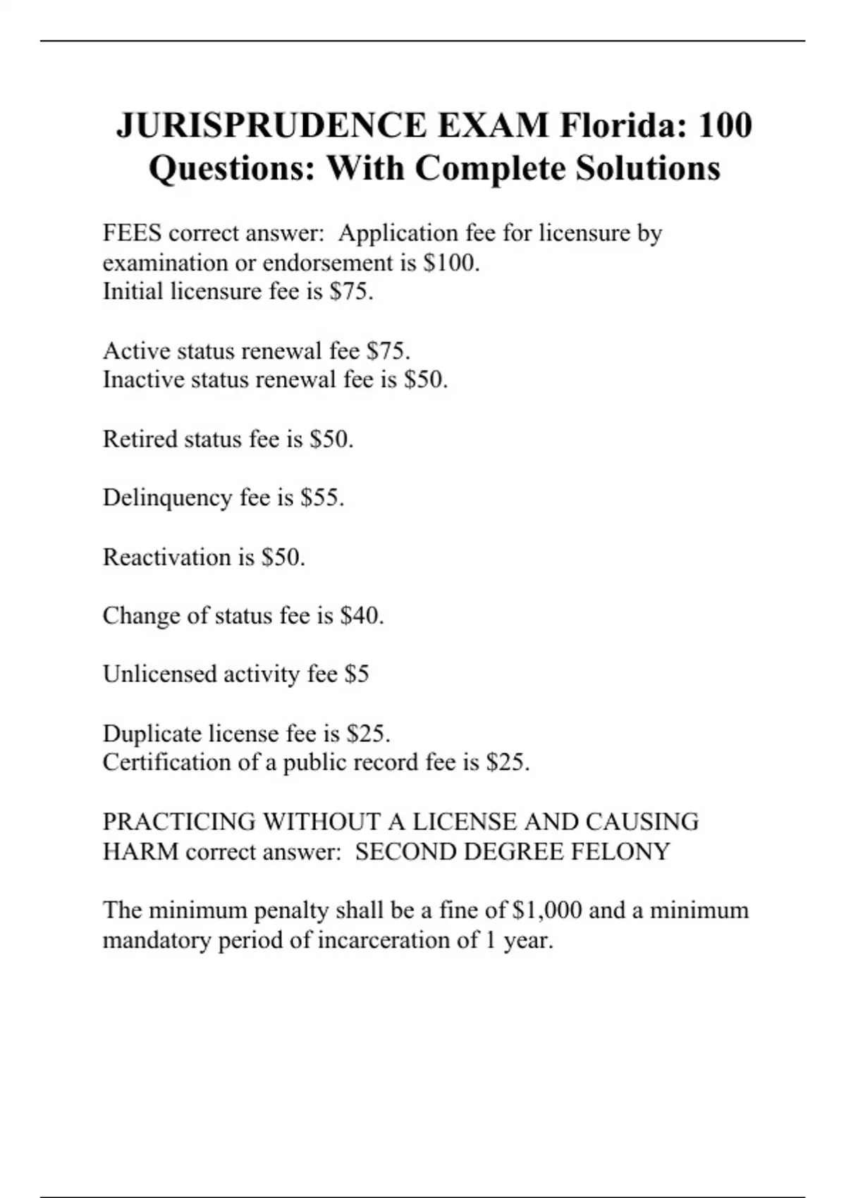 FEES correct answer: Application fee for licensure by examination or endorsement is $100. Initial licensure fee is $75. Active status renewal fee $75. Inactive status renewal fee is $50. Retired status fee is $50. Delinquency fee is $55. Reactivation is $50. Change of status fee is $40. Unlicensed activity fee $5 Duplicate license fee is $25. Certification of a public record fee is $25. PRACTICING WITHOUT A LICENSE AND CAUSING HARM correct answer: SECOND DEGREE FELONY The minimum penalty shall be a fine of $1,000 and a minimum mandatory period of incarceration of 1 year. Financial arrangements between refe